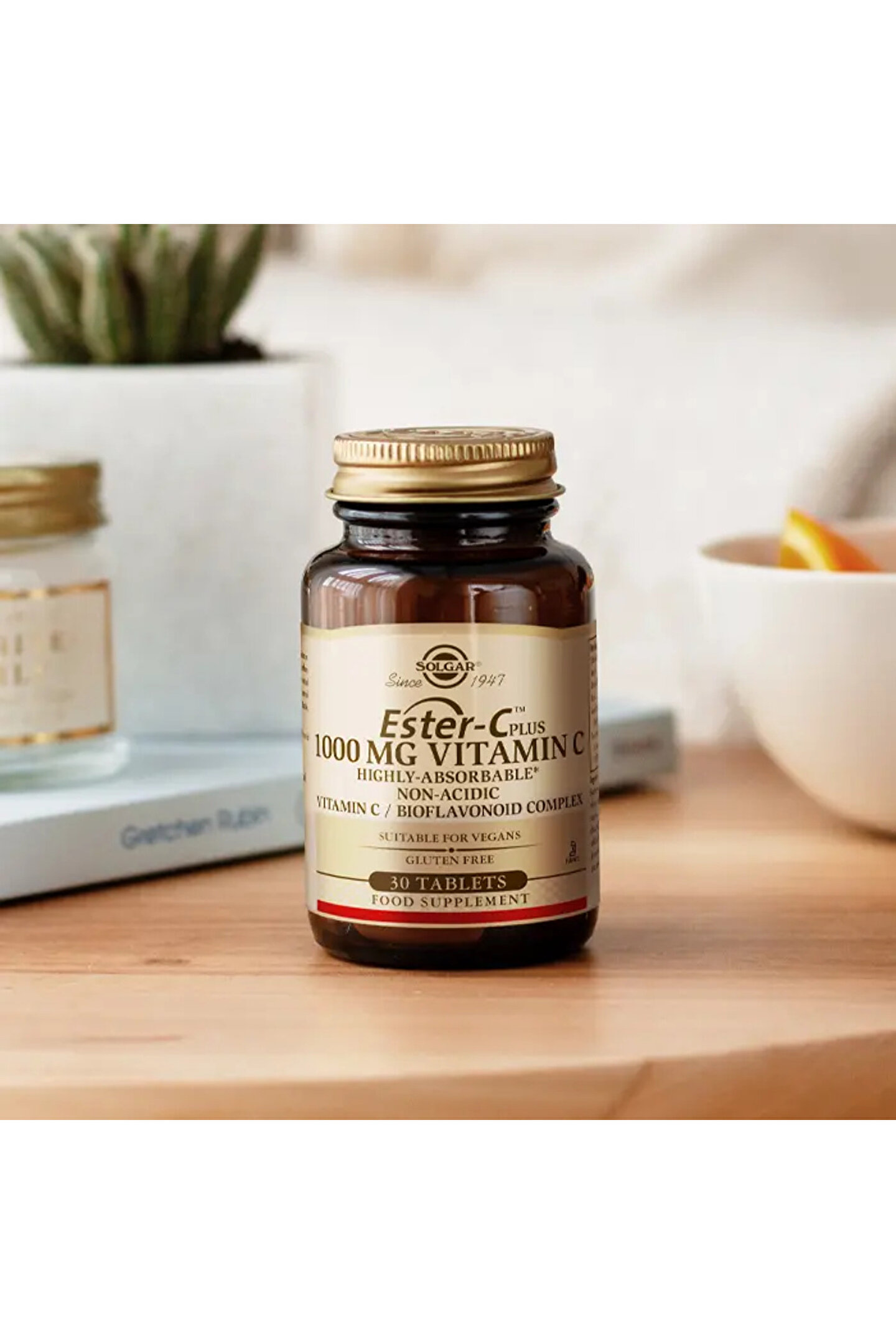 “C vitamini bağışıklık sisteminin normal fonksiyonuna katkıda bulunur.; ” “C vitamini kan damarlarının, kemiklerin, kıkırdağın, diş etlerinin, cildin ve dişlerin normal fonksiyonu için gerekli olan normal kollajen oluşumuna katkıda bulunur.; ” “C vitamini normal enerji oluşum metabolizmasına, yorgunluk ve bitkinliğin azalmasına katkıda bulunur.; ” “C vitamini demir emilimini arttırır.; ”“C vitamini hücrelerin oksidatif stresten korunmasına katkıda bulunur.; ”* Her tablette Vitamin C (Ester-C Kalsiyum L-askorbat) 1000 mg Turunçgil bioflavonoid kompleksi 200 mg Kuşburnu tozu (Rosa canina) (meyve) 25 mg Aserola meyve tozu ekstresi (Malpighia glabra L.; ) (4:1) 25 mg Rutin 25 mg KULLANIM ÖNERİSİ Yetişkinler için, tercihen yemek zamanı, günde bir (1) tablet.; Bol su ile alınız.; EK BİLGİ Şeker, tuz, nişasta içermez.; Maya, buğday, glüten, soya ve süt ürünleri gibi potansiyel alerjenleri içermez.; Renklendirici, yapay aroma, tatlandırıcı ve koruyucular kullanılmamıştır.; Vegan ve vejetaryen bireylerin kullanımına da uygundur.; Hacim arttırıcı (mikrokristalin selüloz), topaklanmayı önleyiciler (silikon dioksit, yağ asitleri, yağ asitlerinin magnezyum tuzları), stabilizör (çapraz bağlı selüloz gam), hacim arttırıcılar (dikalsiyum fosfat, hidroksipropil selüloz), parlatıcılar (hidroksipropilmetil selüloz, gliserin).