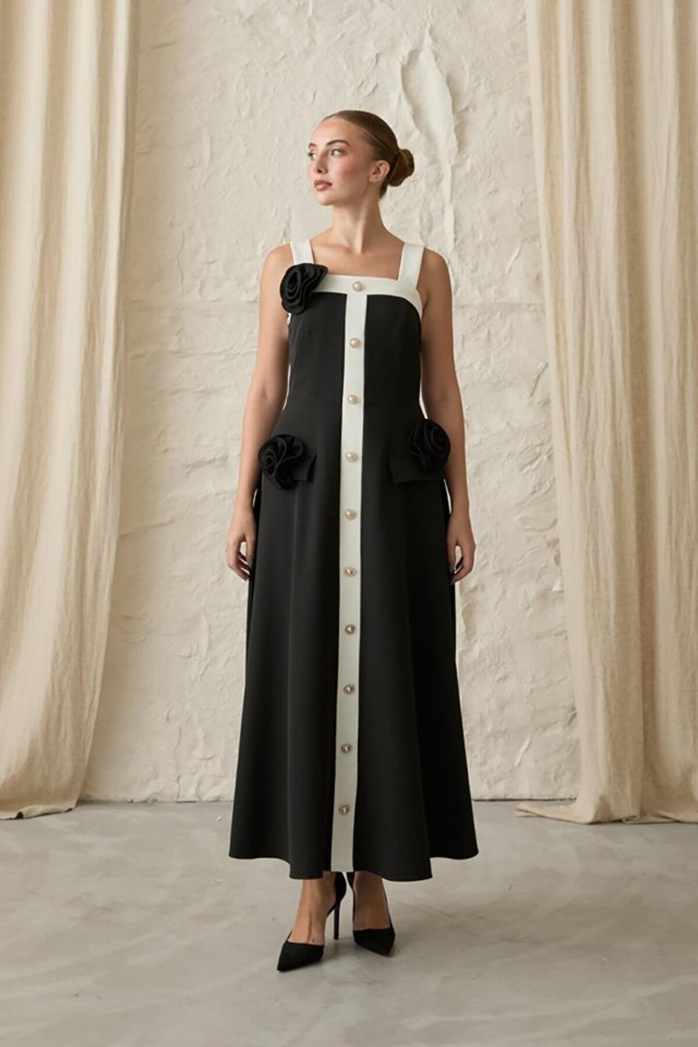 Siyah Güllü Askılı Elbise