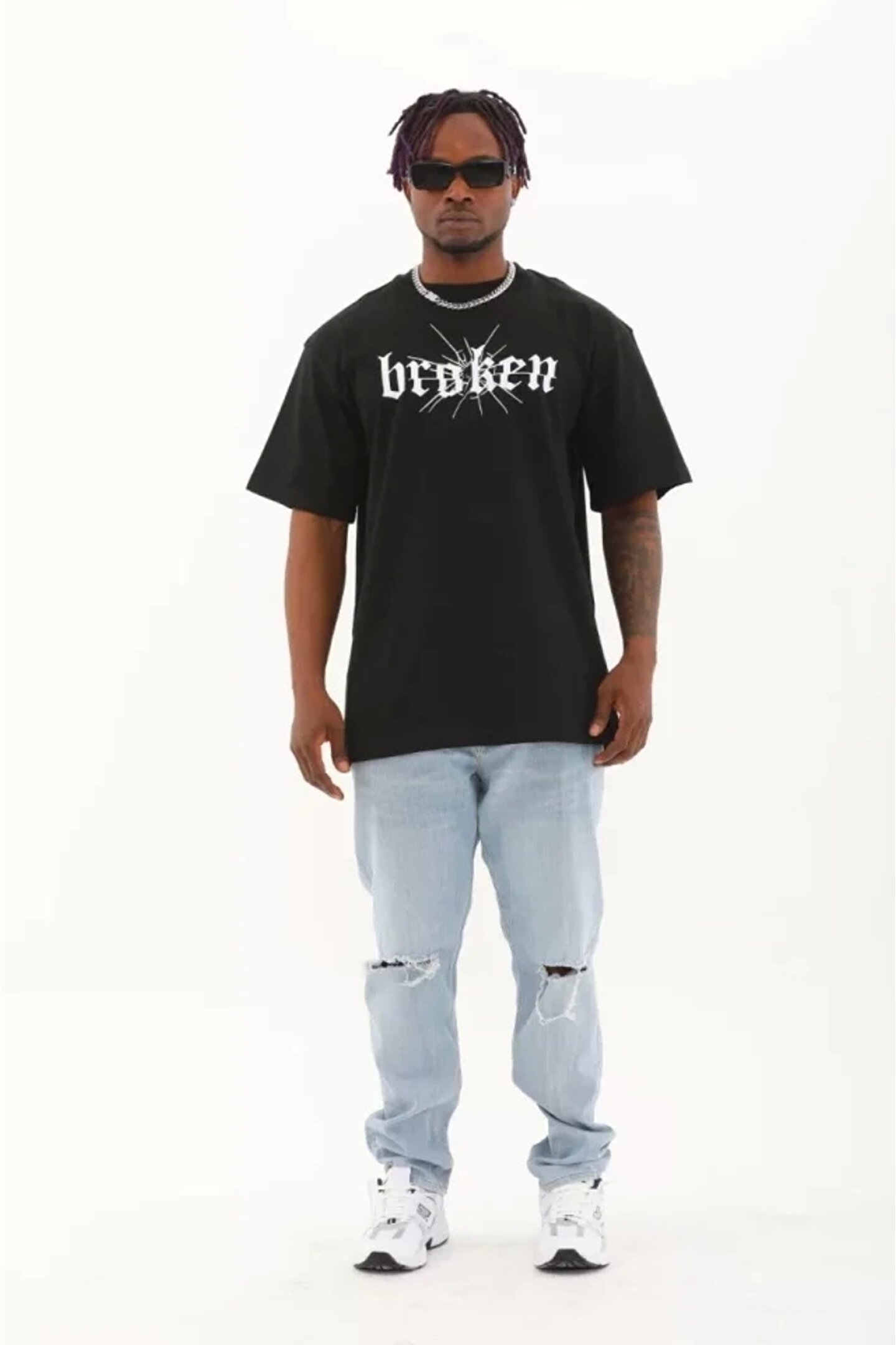 Unisex Oversize Baskılı Bisiklet Yaka T-Shirt - Siyah