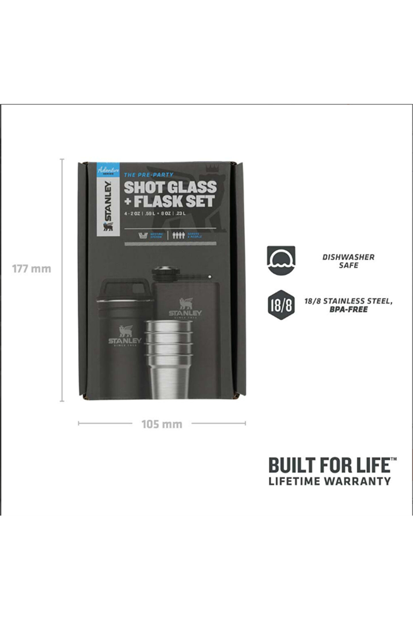 Stanley Adventure Çelik Shot Bardak ve Matara Seti Kampta keyif, uzun bisiklet turları, festivaller, dağ maceraları.; Bu seti götürebileceğiniz o kadar çok yer var ki.; İç içe geçen bardaklar, taşıma çantasına yerleşir ve düşürseniz bile kırılmazlar.; 230 ML'lik ince matara, 4 shot bardaklık içecek taşıyabilir ve çantanıza çok rahat sığar.; Ürün Özellikleri 18/8 Paslanmaz Çelik, BPA'sız.; İç içe geçebilen sistem.; Elde yıkanmalıdır.; Setin içinde:o [4] Shot bardağı (2 OZ / 59 ML)o [1] Paslanmaz Çelik Taşıma kutusuo [1] Matara (8 OZ / .32 L).; Teknik Özellikleri Ağırlık:505 gr.; Boyutlar: 25 x 7.1 x 18 cm.; Set İçeriği: [4] Shot bardakları (2 OZ / 59 ML) [1] Paslanmaz çelik taşıma çantası [1] Şişe (8 OZ / .32 L).; RAHAT TAŞINIR: Stanley bu 59 ml'lik shot bardaklarını açık havada, hareket halindeyken kullanabilmeniz için tasarladı.; DAYANIKLI VE GÜVENLİ: Bu bardaklar 18/8 yüksek kalite, gıdada kullanıma uygun paslanmaz çelikten, hafif, dayanıklı, BPA'sız malzemelerden üretilmiştir.; KOLAY TEMİZLENİR: Kolay temizleyebilmeniz için, bulaşık makinesinin üst rafına yerleştirebilirsiniz.; ÜRETİM KUSURLARINA KARŞI ÖMÜR BOYU GARANTİ! Stanley ürünleri, üretimden kaynaklanan hatalar, yalıtım problemleri ve üretim kaynaklı sızdırma problemlerine karşı ömür boyu garantilidir.; GARANTİ KAPSAMINA GİRMEYEN DURUMLAR Düşme, çarpma ve ezilme sonucu meydana gelebilecek üründeki her türlü hasar ve hasar nedeni ile oluşabilecek yalıtım problemleri (ürünün yeterli ısıyı muhafaza edememesi) Düşme, çarpma ve ezilme sonucu meydana gelebilecek üründeki sızdırma problemleri Düşme, çarpma ve ezilme neticesinde ürünün gövdesindeki / parçalarında ki kırıklar ve deformasyonlar Kargodan kaynaklı her türlü hasar Kullanım, bakım ve temizlik koşullarına uyulmaması gibi durumlar sonrasında iç ve dış yüzeyde oluşabilecek hasarlar, bozulmalar ve paslanma/korozyonlar garanti kapsamına girmemektedir.