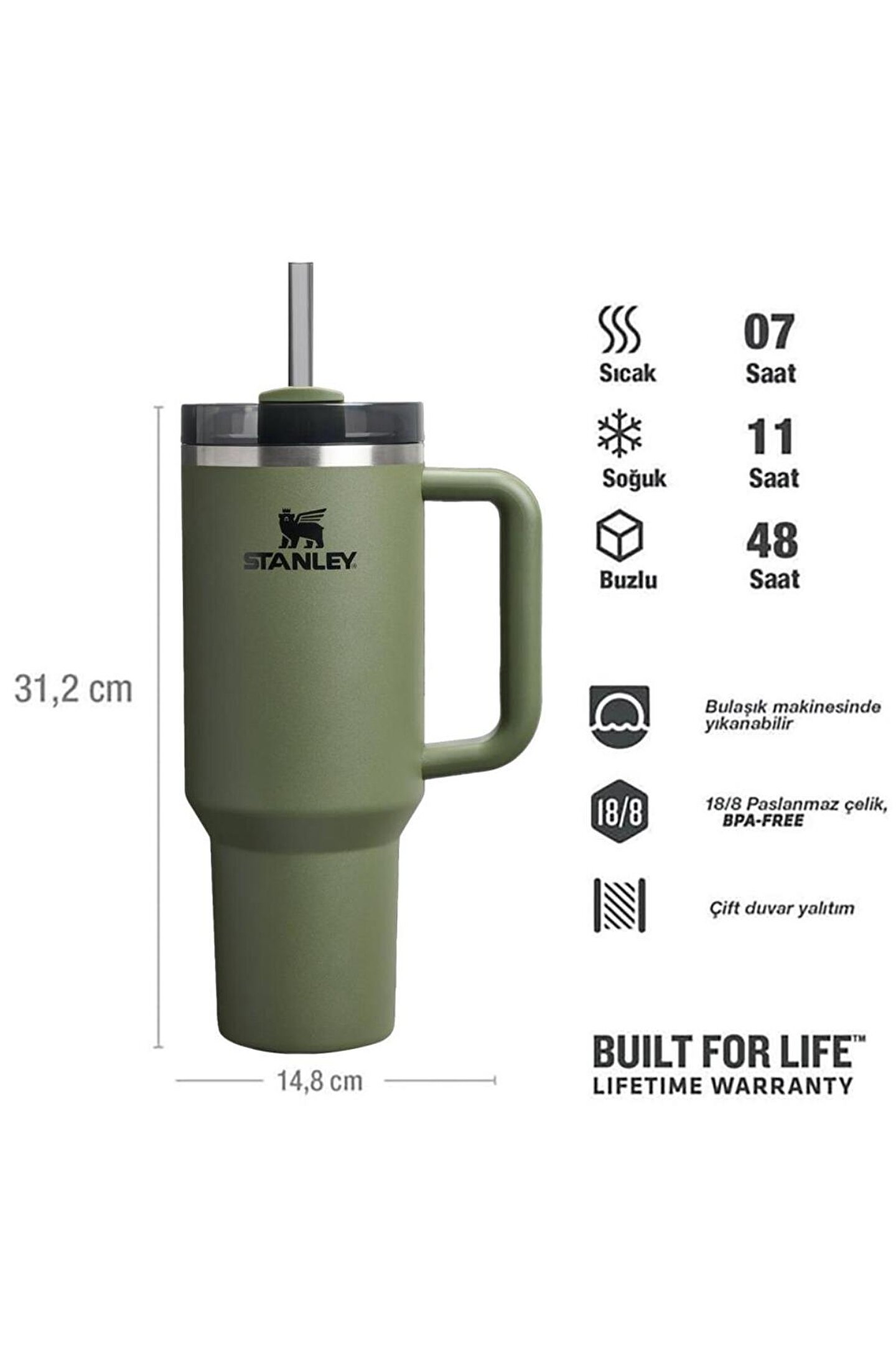 Stanley The Quencher H2.O Flowstate 1,18L Termos Stanley Quencher, günlük yaşamınızda, antrenmanlarınızda veya uzun iş günlerinde içeceklerinizi saatlerce soğuk tutabilmek için özel olarak tasarlandı.; Quencher’ın kapağı, kullanım kolaylığı sağlayan üç farklı özelliğe sahiptir.; Üç aşamalı çevrilebilir kapak tasarımı sayesinde hem pipetli hem de pipetsiz kullanılabilir.; Taşıma sırasında etrafa sıvı sıçramasını önlemek için ise pipeti çıkararak kilitli konuma getirebilirsiniz.; Stanley Quencher, araç bardaklıklarıyla uyumludur, ve ergonomik ve sağlam bir kulp tasarımına sahiptir.; Kapak tasarımı sıçramaları en aza indirecek şekilde tasarlanmıştır.; Pipet ile kullanımın doğası ve kapak yapısının şekli nedeni ile Stanley Quencher yan veya ters çevrildiği zaman pipet kısmından veya kapak kilitli konumda iken akıtma yapabilir.; 90% geri dönüştürülmüş, 18/8 paslanmaz çelik, BPA içermez.; Bardağın iç kısmında göreceğiniz geri dönüştürülmüş paslanmaz çelik amblemi, termosunuzun sürdürülebilir malzemelerden yapıldığını gösterir.; Çift duvarlı vakumlu yalıtım.; Mat boya kaplama.; FlowState™ 3 aşamalı çevrilebilir kapak.; Tekrar kullanılabilir pipet.; Rahat tutuş sağlayan kulp.; Araba bardaklığı ile uyumlu (Taban çapı: 7,9 cm).; Bulaşık makinesine girebilir ancak elde yıkama tavsiye edilir.; Kapasite: 1,18 Litre Boyutlar: : 9,8 cm uzunluk, 14,8 cm genişlik, 31,2 cm yükseklik.; Ağırlık: 635 Gram Soğuk 11 Saat Buzlu İçecekler: 48 Saat