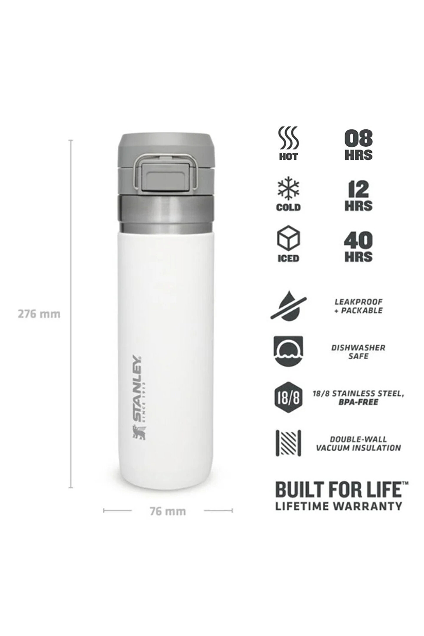 Quick Flip Serisi 0.70l Kilit Mekanizmalı Su TermosuStanley Quick Flip Serisi'nin bu su termosu, günün her anında yanınızda olmaya hazır.; Polar rengi ile modern ve şık bir görünüm sunan bu termos, dayanıklı 18/8 paslanmaz çelik yapısı ve çift duvarlı vakum yalıtımı sayesinde içeceklerinizi uzun süre ideal sıcaklıkta tutar.; İster spor yaparken, ister ofiste çalışırken, ister yolculuk sırasında, bu termos pratik ve güvenilir yapısıyla ihtiyaçlarınızı karşılar.; Basarak açılan kolay kapak mekanizması ve sızdırmaz özellikleri ile her an kullanıma hazırdır.; Araba bardaklığına uyumlu olması, seyahatlerinizde de büyük kolaylık sağlar.; Ürün Özellikleri: Hacim: 0. 70 litre.; Ağırlık: 420 gram.; Boyutlar: 27. 6 cm yükseklik, 7. 6 cm genişlik.; Malzeme: 18/8 paslanmaz çelik.; Yalıtım: Çift duvarlı vakum yalıtımı.; Kapak: Basarak açılan, mühürlenen sızdırmaz kapak.; Özellikler: Kolay taşınabilir, buz eklemek ve derin temizlik için iki aşamalı kapak.; Uyumluluk: Araba bardaklığına uyumlu.; Performans: Sıcak içecekler için 8 saat, soğuk içecekler için 12 saat, buzlu içecekler için 40 saat.; Stanley Quick Flip Serisi - 0. 70L Kilit Mekanizmalı Su Termosu, günlük aktivitelerinizde güvenle kullanabileceğiniz bir üründür.; Polar rengi ile her ortamda şıklık katar, yüksek performanslı yalıtım ve pratik kullanım özellikleri ile içeceklerinizi her zaman istediğiniz sıcaklıkta tutar.; Günlük koşuşturmacanızda size eşlik edecek bu termos, her anınıza konfor ve kolaylık getirmek için tasarlandı