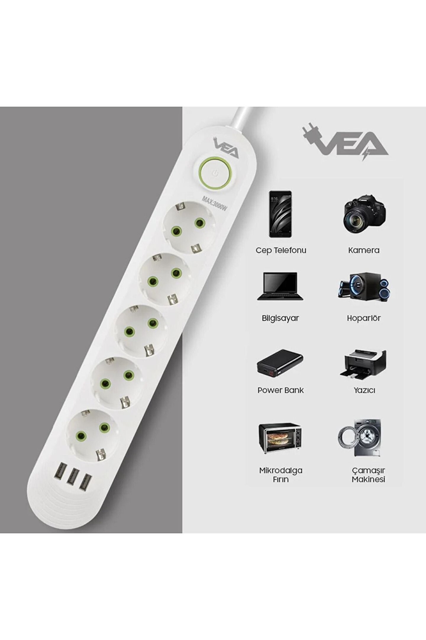 1005813 htcx 5'Lİ 1.5 METRE KABLOLU 3 USB'Lİ BEYAZ AKIM KORUMALI PRİZ BAKIR KABLO HARİCİ GÜÇ ANAHTARI shpwave