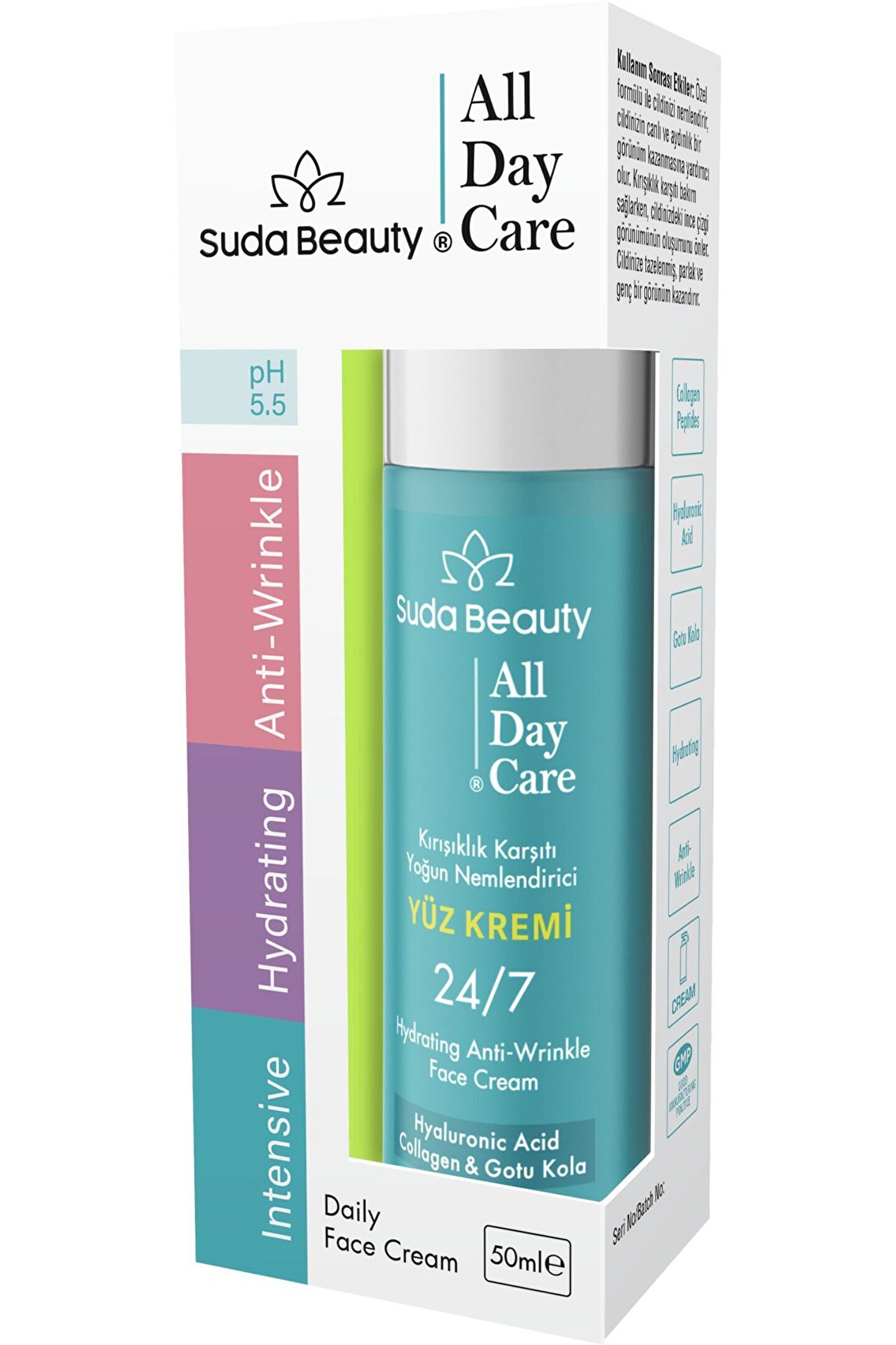 KOLAJENİ artık hepimiz çok iyi biliyoruz.; Eminim bir çoğunuz son birkaç yıldır bu çok değerli PROTEİNİ bir kere bile olsa deneyimlediniz.; KOLAJENİN FAYDALARINI,CİLDİMİZE ETKİLERİNİ değerli hekimlerimizden ve otoriterlerden dinlediniz ; TÜRKİYE'de marka Lideri olan SUDA COLLAGEN bu değerli Proteinin cildimize etkilerini artırmak için TÜRKİYE'de hatta Dünyada İlk İKİLİ formülü geliştirdi.; ; ' İçten gelen güzellik, dıştan gelen güzellik ' sloganı ile birleşiyor.; ; Çifte Destek, Çifte Etki! ; 'BİRLİKTA DAHA DA GÜZELİZ !‘ ; Suda COLLAGEN çeşitlerimiz şimdi Suda BEAUTY ALL DAY CARE krem ile birlikte cilt bakımınıza destek oluyor.; ; Hyaluronik Asit ve Kolajen içeren formülü ile Suda BEAUTY kremimiz güzellik rutininizde fark yaratmak için burada! ; Suda Kolajen cildinizi dışarıdan da desteklemek için bu mükemmel KIRIŞIKLIK KARŞITI ,YOĞUN NEMLENDİRİCİ YÜZ KREMİ İLE birlikte geliyor.; ; Cilt sağlığı için en iyi bileşenlerinin gücünden yararlanan kremimiz, olumlu sonuçlar sunmak için özel bir şekilde formüle edilmiştir.; Hem içten hem dıştan birlikte alınan Hyalüronik Asit olağanüstü bir nemlendirici görevi görür, cildin nem seviyelerini arttırır, cilde nüfuz ederek canlı ve parlayan dolgun, esnek bir cilt sağlar.; ; İçten ve dıştan alınan Kolajen, Hyalüronik Asit ile uyum içinde çalışır.; ; SUDA COLLAGEN ve SUDA BEAUTY bakım kremi mükemmel bir sinerji ile birlikte etki gösterir.; Ancak SUDA BEAUTY kreminin faydaları bununla sınırlı değil! Gelişmiş formülümüz, kapsamlı bir cilt bakımı çözümü sağlamak için klasik kremlerin ötesine geçer.; Yalnızca yaşlanma belirtilerini gidermekle kalmaz, aynı zamanda cildinizi besler ve çevresel stres faktörlerine karşı korur.; ; Serbest radikallere antioksidan görevini görür .; ; Nazik ama güçlü topikal kremimiz aşağıdakiler için uygundur: ; - Cildin nem dengesini sağlar.; ; .; ; - Cilt tonunu eşitler.; ; - Kuruluğu önler.; ; - İnce çizgileri düzeltir.; ; - Cildi sıkılaştırır.; ; Şimdi neymişiz ? 'BİRLİKTA DAHA DA GÜZELİZ !‘ ;
