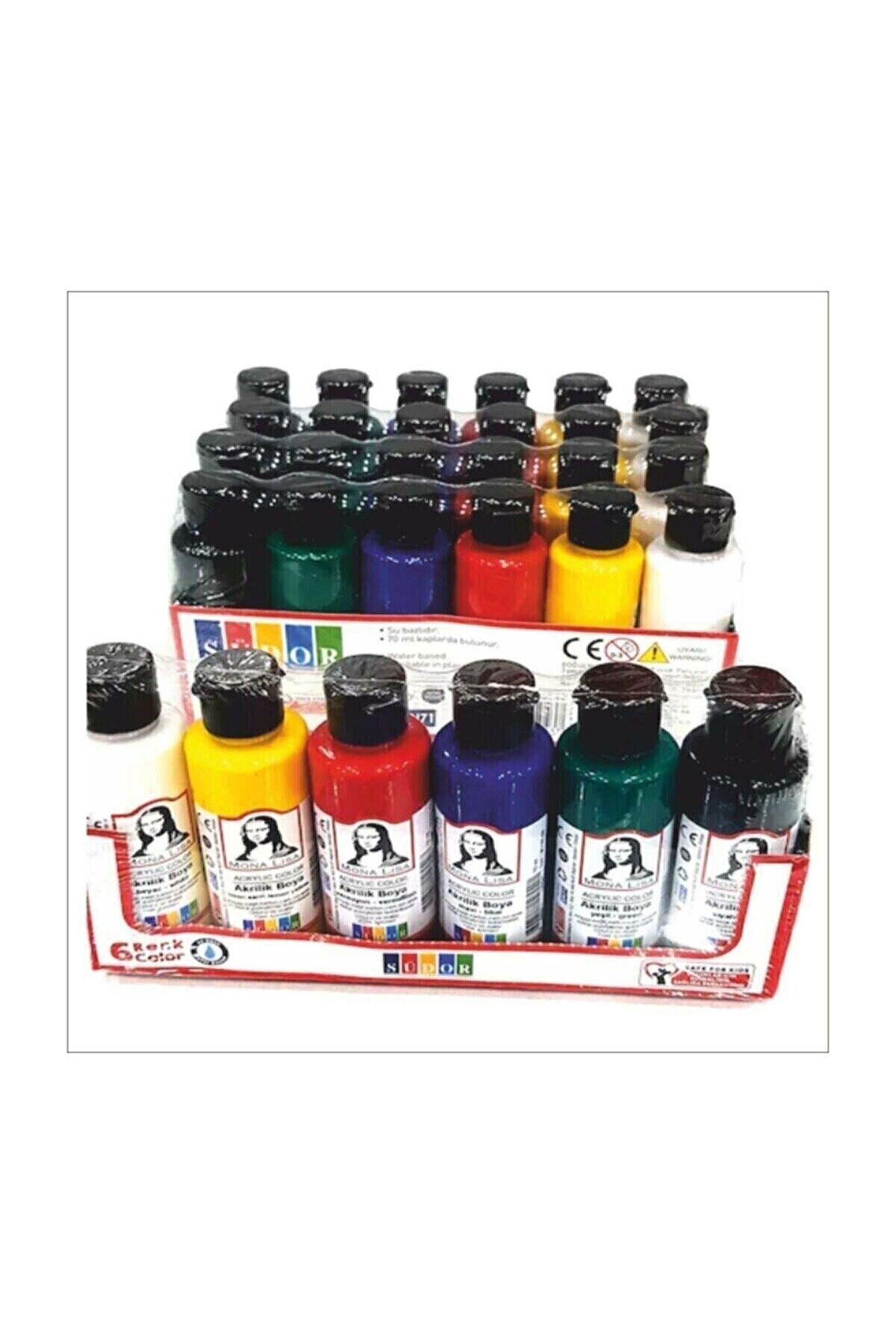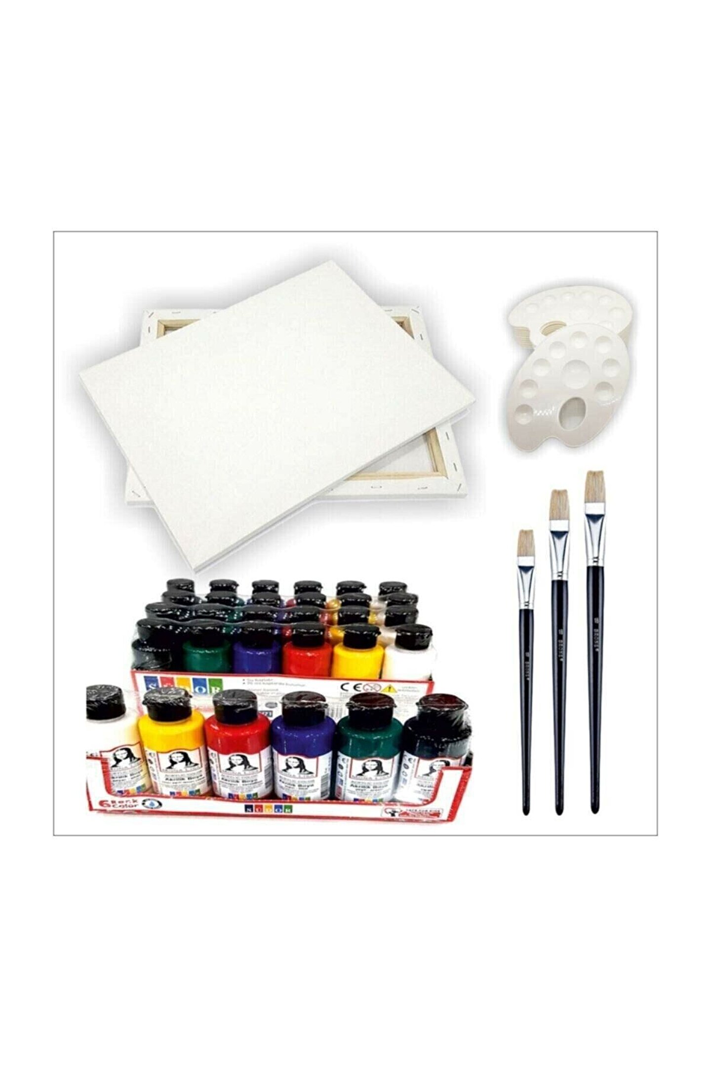 4lü set; 1 adet 25*35 cm tuval; 6 adet akrilik boya mona lisa (her biri 70ml x 6adet); 3 adet akrilik boya fırçası (4 - 6 - 12); 1 adet 20 cm palet; ;