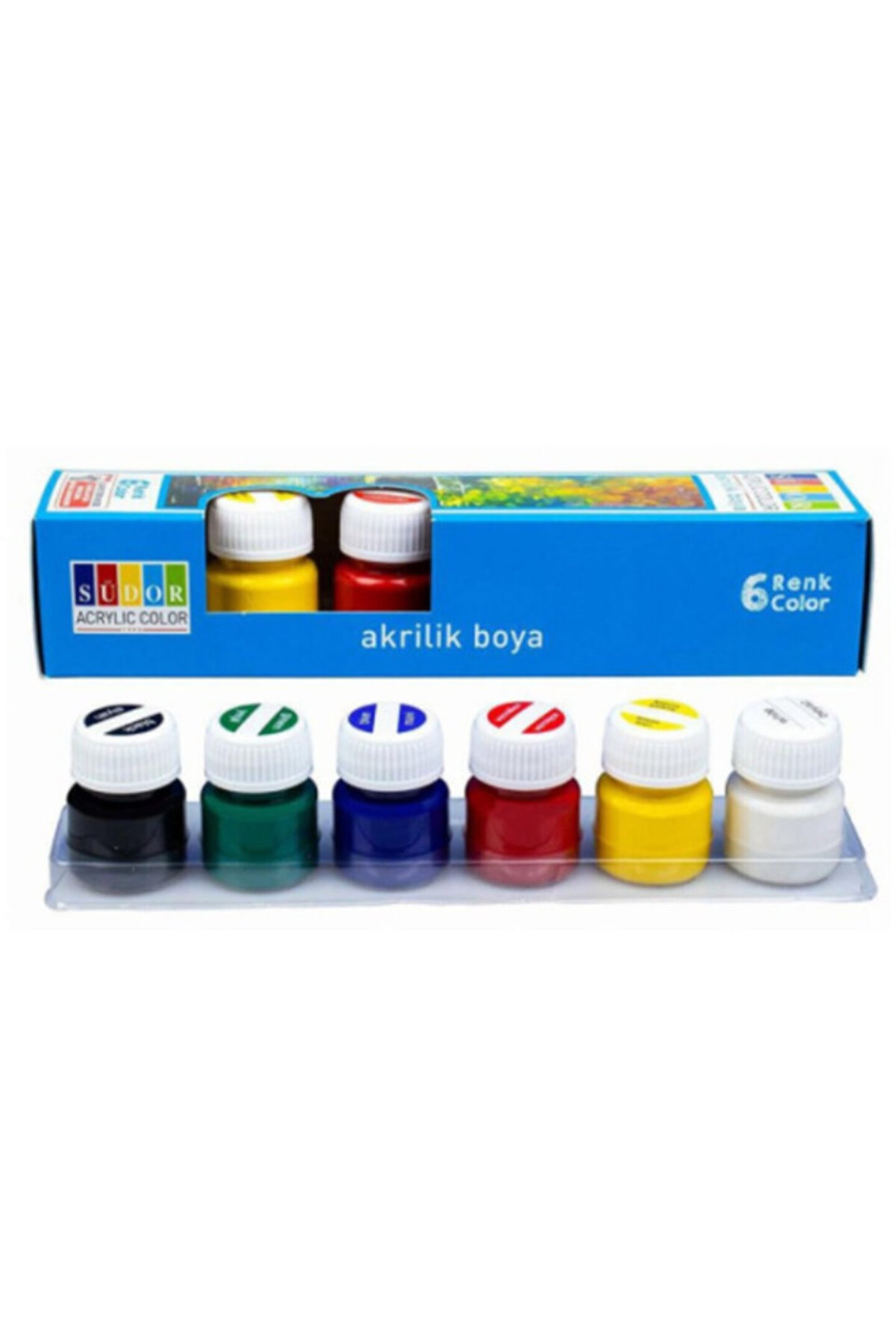 Südor akrilik boya 6 renk x 15 ml şişe ; Tüm ahsap zeminlerde, kagit, karton, cam, seramik ve metal yüzeylere uygulanabilir. ; Kuruduktan sonra örtücü ve mattir. ; Solvent içermez. ; Su ile inceltilerek renkler karistirilabilir. ; Parlatmak için südor parlak vernik kullanilir. ;