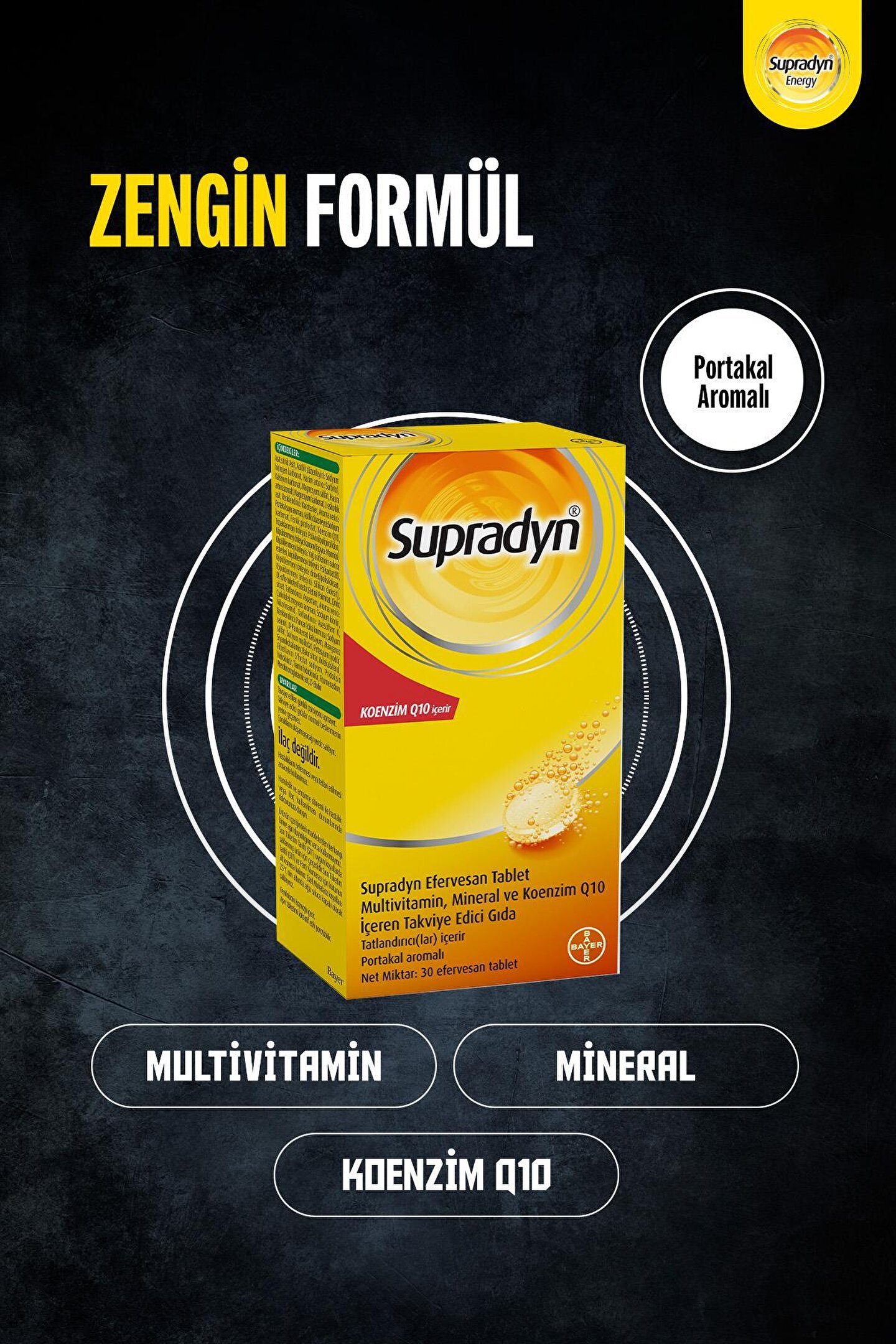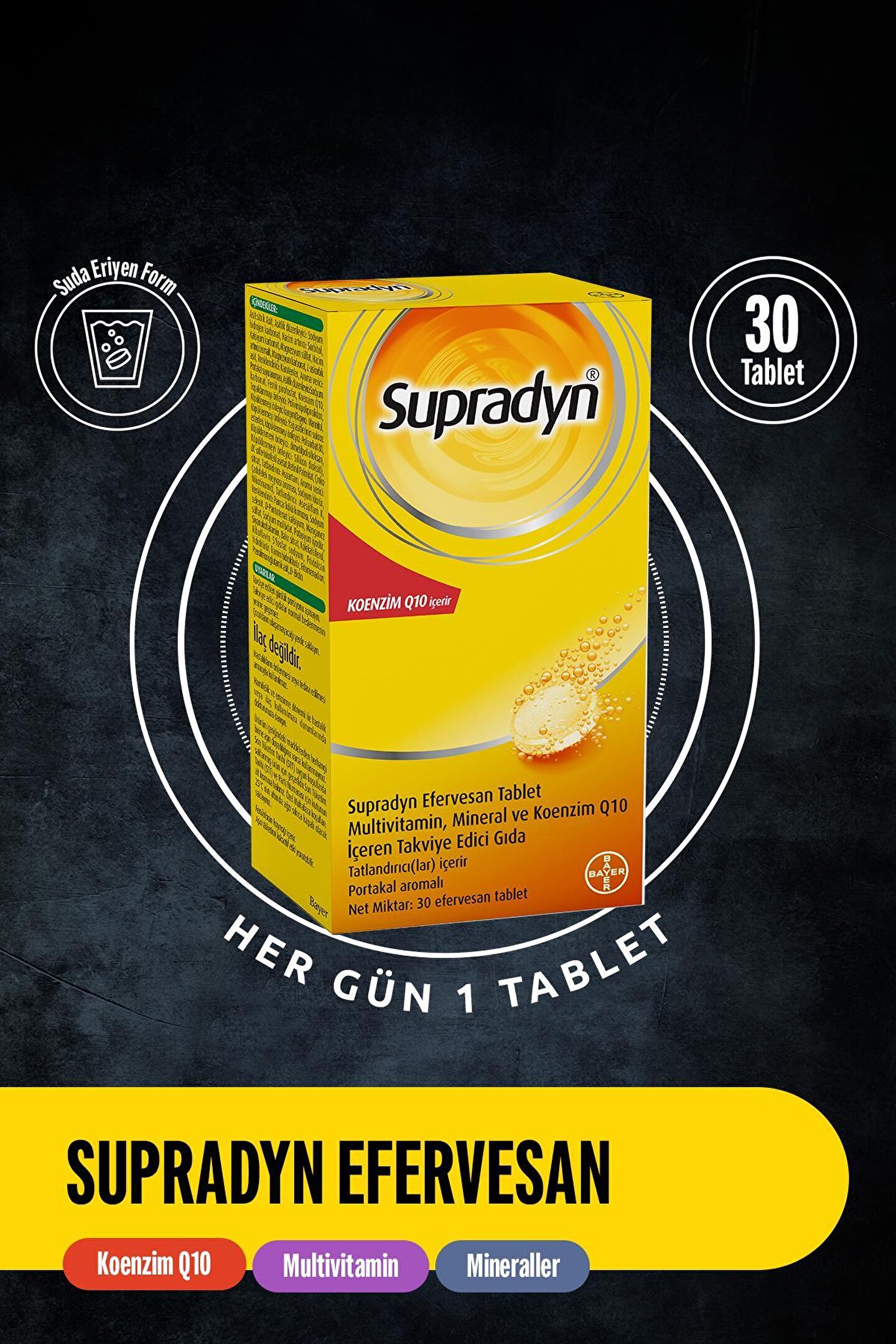 Supradyn Efervesan Tablet Multivitamin, Mineral ve Koenzim Q10 İçeren Takviye Edici Gıda Tatlandırıcı(lar) İçerir; Portakal aromalı Net Miktar: 30 Efervesan Tablet İçindekiler Asit: Sitrik Asit, Asitlik düzenleyici: Sodyum hidrojen karbonat, Hacim artırıcı: Sorbitol, Kalsiyum karbonat, Magnezyum sülfat, Hacim artırıcı: İzomalt, Magnezyum karbonat, L; askorbik asit, Renklendirici: Karoten, Aroma verici: Portakal suyu aroması, Asitlik düzenleyici: Sodyum karbonat, Ferrik pirofosfat, Koenzim Q10, Topaklanmayı önleyici: Polivinilpolipirolidon, Köpüklenmeyi önleyici karışım (Taşıyıcı: Mannitol, Köpüklenmeyi önleyici: Yağ asitlerinin sukroz esterleri, Köpüklenmeyi önleyici: Polisorbat 80, Köpüklenmeyi önleyici: Dimetilpolisiloksan, Köpüklenmeyi önleyici: Silikon dioksit), DL; alfa; tokoferil asetat, Retinil palmitat, Çinko sitrat, Tatlandırıcı: Aspartam, Aroma verici: Çarkıfelek meyvesi aroması, Sodyum klorür, Nikotinamid, Tatlandırıcı: Asesülfam K, Renklendirici: Pancar kökü kırmızısı, Sodyum selenit, D; Pantotenat kalsiyum, Manganez sülfat, Sodyum molibdat, Potasyum iyodür, Siyanokobalamin, Bakır sitrat, Kolekalsiferol, Riboflavin 5’fosfat sodyum, Pridoksin hidroklorür, Tiamin hidroklorür, Fitomenadion, Pteroilmonoglutamik asit, D; Biotin; KULLANIM TALİMATI VE TAVSİYE EDİLEN GÜNLÜK ALIM DOZU (PORSİYON MİKTARI) Yetişkinler için günde 1 tablet 200 ml (1 bardak) suda çözündürülerek tüketilir; Uyarılar Tavsiye edilen günlük porsiyonu aşmayın; Takviye edici gıdalar normal beslenmenin yerine geçemez; Çocukların ulaşamayacağı yerde saklayın; İlaç değildir; Hastalıkların önlenmesi veya tedavi edilmesi amacıyla kullanılmaz; Hamilelik ve emzirme dönemi ile hastalık veya ilaç kullanılması durumlarında doktorunuza danışın; Ürünün içeriğindeki maddelerden herhangi birine karşı aşırı duyarlılığınız varsa kullanmayınız; Son Tüketim Tarihi (STT) ve Parti Numarası için kutunun altına bakınız; Özel muhafaza koşulları: 25 °C’nin altında ağzı sıkıca kapalı olarak saklayınız; Son tüketim tarihi uygun koşullarda salanmış ürün için geçerlidir; Fenilalanin kaynağı içerir; Aşırı tüketimi laksatif etki yaratabilir;