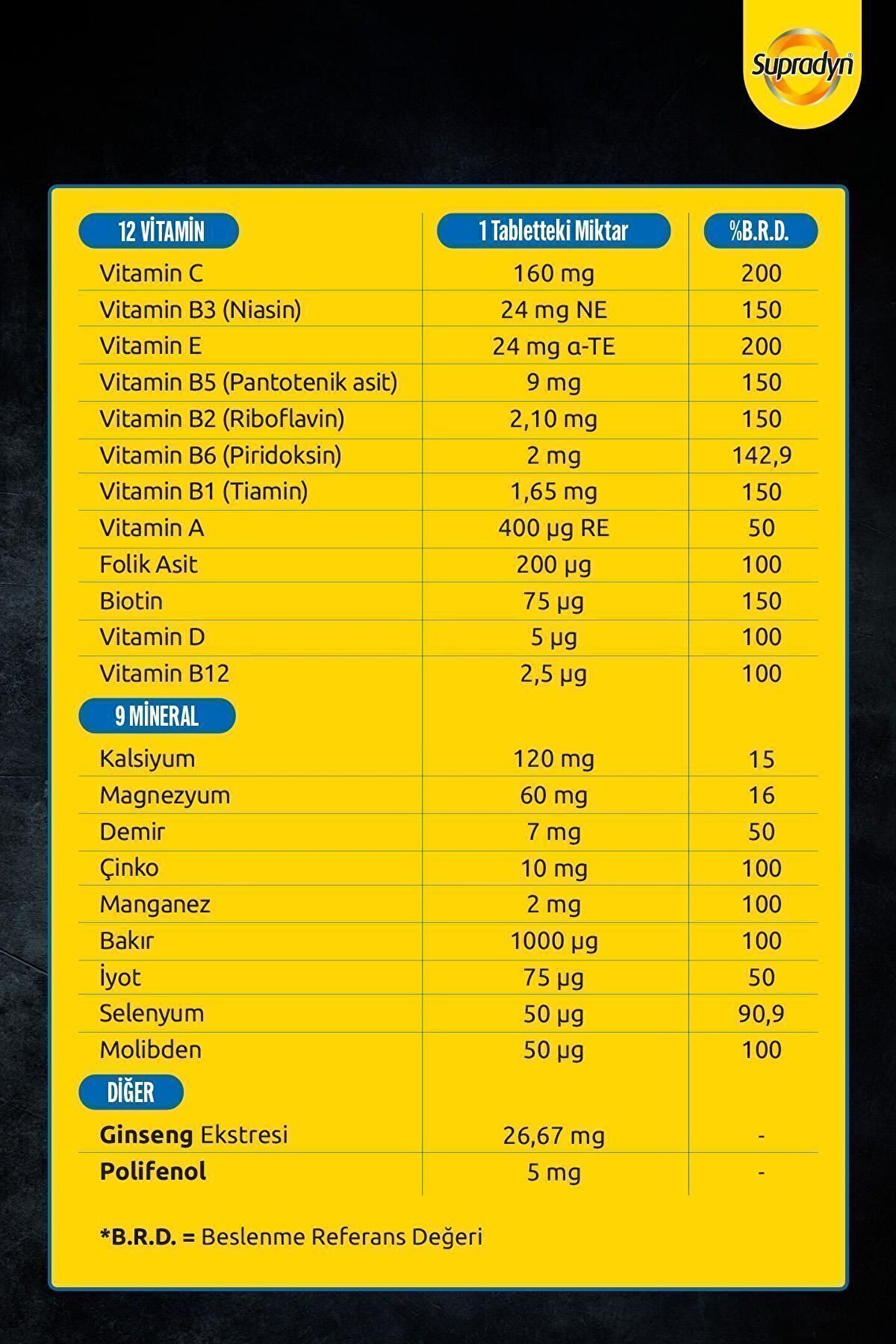 Supradyn Focus Film Kaplı Tablet Multivitamin, Mineral, Ginseng ve Zeytin Polifenolü İçeren Takviye Edici Gıda Net Miktar: 30 Film Kaplı Tablet / 37,6 g İçindekiler Kalsiyum karbonat, L; Askorbik asit, Hacim arttırıcı: (Mikrokristalin selüloz, Polidekstroz), Maltodekstrin, Magnezyum oksit, DL; ?; takoferil asetet, Stabilizör: Çapraz bağlı sodyum karboksi metil selüloz, Polifenol, Ginseng ekstresi, Nikotinamid, Ferroz fumarat, Parlatıcı: Hidrokipropil metil selüloz, Çinko oksit, Topaklanmayı önleyici: (Silikon dioksit, Yağ asitlerinin magnezyum tuzları, Talk), D; Pantotenat kalsiyum, Retinil palmitat, Renklendirici: (Kalsiyum karbonat, Demir oksitler ve hidroksitler), Siyanokobalamin, Piridoksin hidroklorür, Bakır sülfat, Riboflavin, Kolekalsiferol, Tiamin monohidrat, Orta zincirli trigliseritler, Manganez sülfat, Potasyum iyodat, Pteroilmonoglutamik asit, Sodyum molibdat, Sodyum selenit, D; biotin KULLANIM TALİMATI VE TAVSİYE EDİLEN GÜNLÜK ALIM DOZU (PORSİYON MİKTARI) Yetişkinler için günde 1 tablet bir bardak su ile alınır; Uyarılar İlaç değildir;