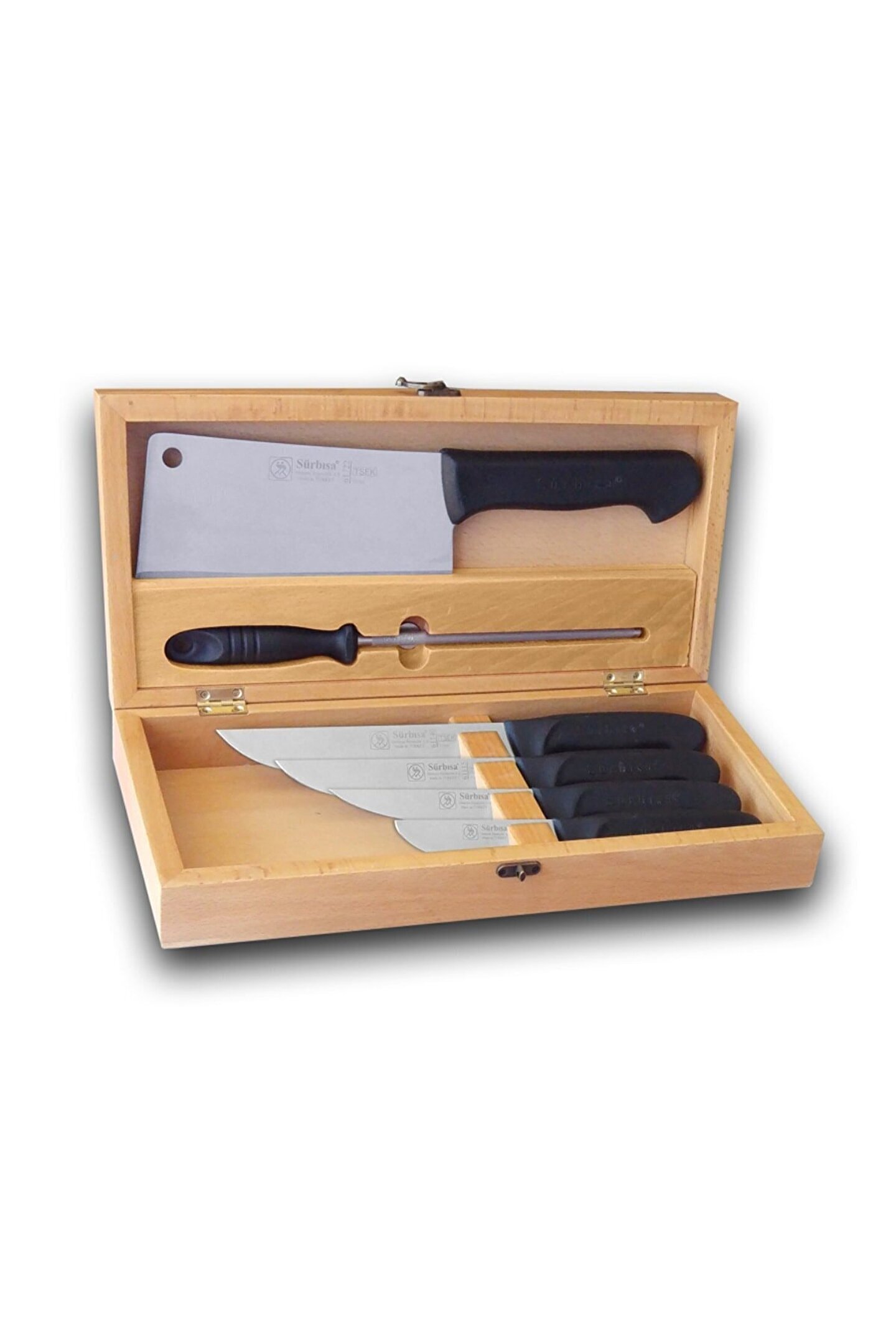Setteki bıçakları; Sürbisa deri yüzme bıçağı ; Sürbisa kemik sıyırma bıçağı ; Sürbisa kasap bıçağı ; Sürbisa kasap bıçağı ; Sürbisa doğrama satırı ; Flugel yuvarlak masat ; Dikkat edilecek hususlar Kesinlikle! Buzlu etleri kesmeye ya da kırmaya çalışmayın. ; Bıçağınızı kullandıktan sonra Bulaşık makinasındaKesinlikle yıkamayın! ; Bıçağınızı kullandıktan sonra ıslak bir süngerle elde yıkayıp kuru bir şekilde saklamalısınız. ; Bıçakların yüksek sıcaklık altında ve ağır temizleyici kimyasallarla yıkanmamasına özen göstermelisiniz. (yüksek sıcaklık ve ağır temizlik kimyasalları ağızının ve sapının bozulmasına neden olur.) ; Bıçağınızı kemik ya da benzeri sert yüzeylere vurmayın ya da kesmeye çalışmayın. ; Bıçaklarınızın ağzı köreldiğinde mutlaka işinin ehli usta bıçak bileyiciler tarafından bilenmesi gerekmektedir. Alışılan büyük çark taşlarında yapılan bilemeler bıçağınızın yanmasına ve çeliğinin sertliğini yitirmesine sebep olmaktadır. Lütfen bilinçli ve tecrübeli bileyicileri tercih edin. ; Bıçağınızın çabuk körelmesinin en büyük sebebi, kesim yaptığınız yüzeylerdir. Sert zeminler üzerinde kesim yapmamanızı öneriyoruz.(taş beton zeminler, mermer zeminler, kalebodur zeminler vs.) ; Kesim yüzeyi için tse belgesine sahip polietilen kesim levhalarını kullanmanız hem bıçaklarınızın ömrünü uzatacak hem de en üst seviyede hijyen sağlayacaktır. ; Bıçaklarınızı konserve açmak, vida açmak, sert yüzeyleri delmek için kesinlikle kullanmayınız. Bıçaklar gıda doğrama, soyma ve bunun gibi işler için en üst seviyede verim alabileceğiniz şekilde üretilmektedir. Üretim amacının dışında kullanmanız hem bıçağınızı kullanılmaz hale getirebilir hem de yaralanmanıza sebep olabilir. ; Temizleme Bıçağınızla işiniz bittikten sonra ılık sabunlu su ile yıkamanızı ve kuru bir havlu ile kurulamanızı tavsiye ediyoruz. Birçok gıda maddesi asit içermektedir (meyveler, sebzeler, etler vs.) bıçağınızın üzerinde kalan gıda parçaları bıçağınızı aşındırır ve aşınan bu kısımlarının oksitlenmesine hatta paslanmasına yol açabilir. Lütfen bıçaklarını elde yıkayıp kuru bir şekilde muhafaza edin. ;