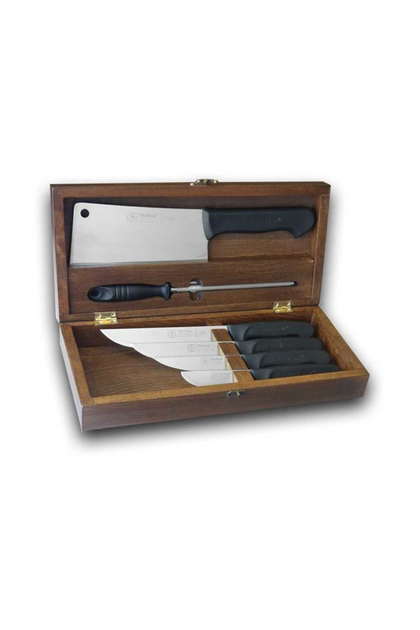Paslanmaz çelik malzemesi sayesinde uzun ömürlü kullanım ve dayanıklılık sunar; Ahşap sandıkta gelen 6 parça bıçak seti, mutfakta ihtiyacınız olan her türlü kesim için idealdir; Çatal, bıçak, masat ve satır kurban bıçağı gibi temel bıçakları içerir, böylece çeşitli yemek hazırlama işlemlerinizde kolaylık sağlar;