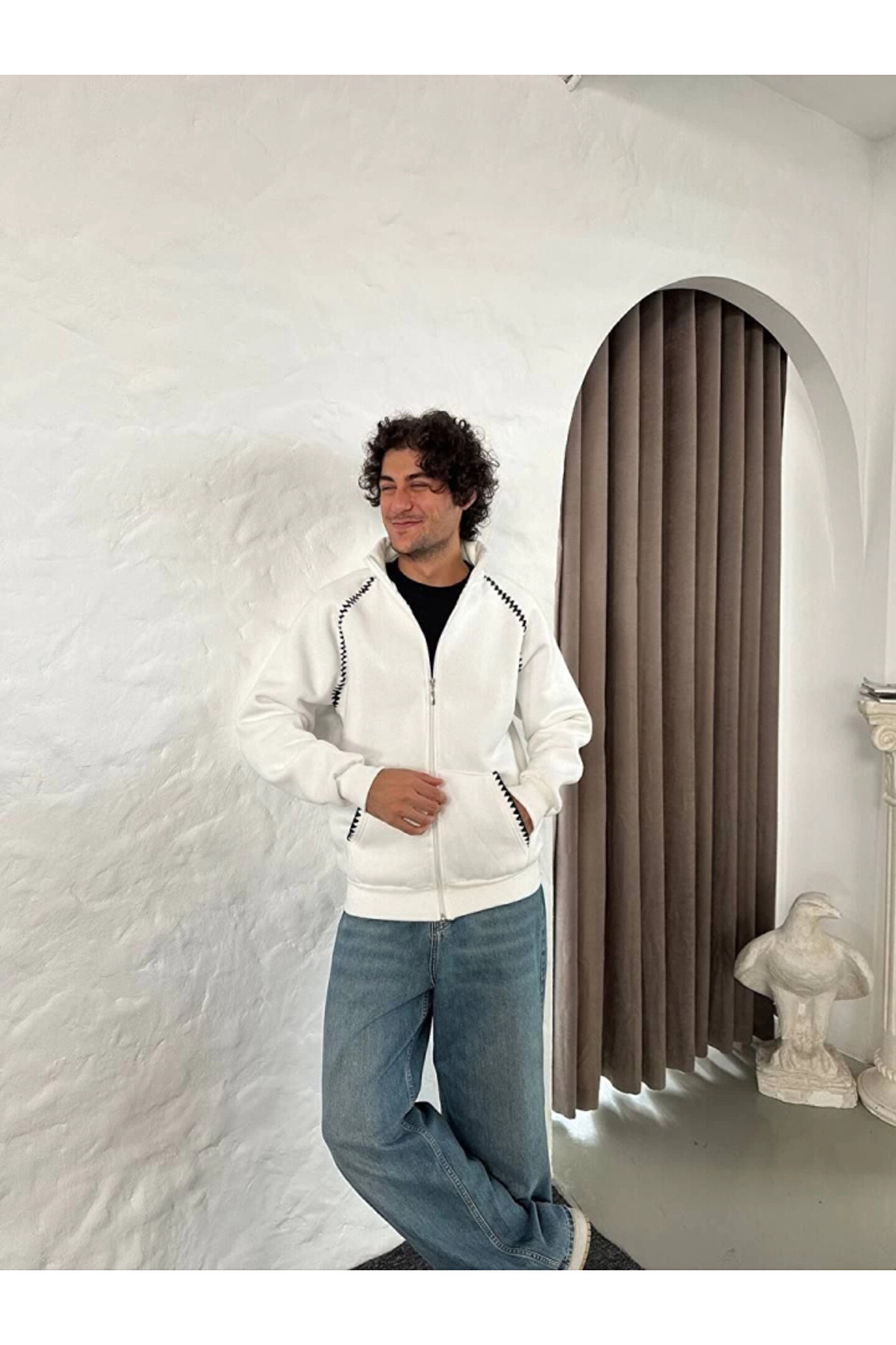 Tam12den Home EQURİ Erkek Oversize Dik Yaka Fermuarlı Sweatshirt - Zincir Nakışli Kanguru Cepli - Beyaz