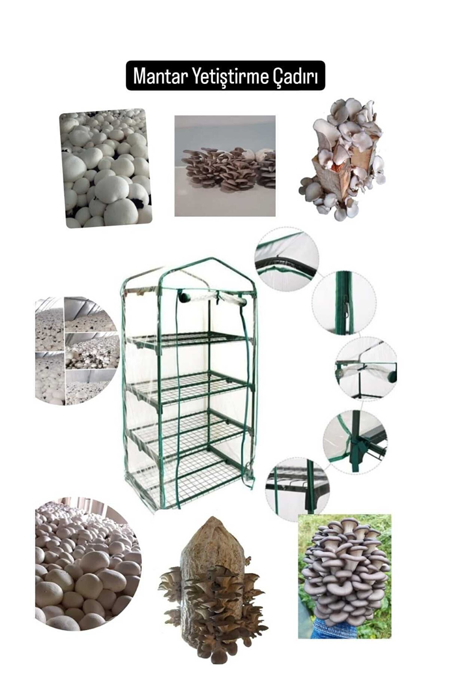 BOY 150 CM, EN 68 CM, DERİNLİK 48 CM 4 KATLI VE ÖZEL ŞEFFAF PVC ÇİFT FERMUARLI BRANDALI. ; RAFLAR HAVA VE IŞIK SİRKİLASYONU AMAÇLI IZGARA ŞEKLİNDEDİR. ; YANINDA KURULUM ŞEMASI DA GÖNDERİLİYOR. ; EVİNİZDE, BALKONUNUZDA, DIŞARIDA, KISACASI UYGUN ISI VE IŞIK ORTAMI OLAN HER YERDE BU SERA SAYESİNDE MANTAR YETİŞTİREBİLİRSİNİZ.;