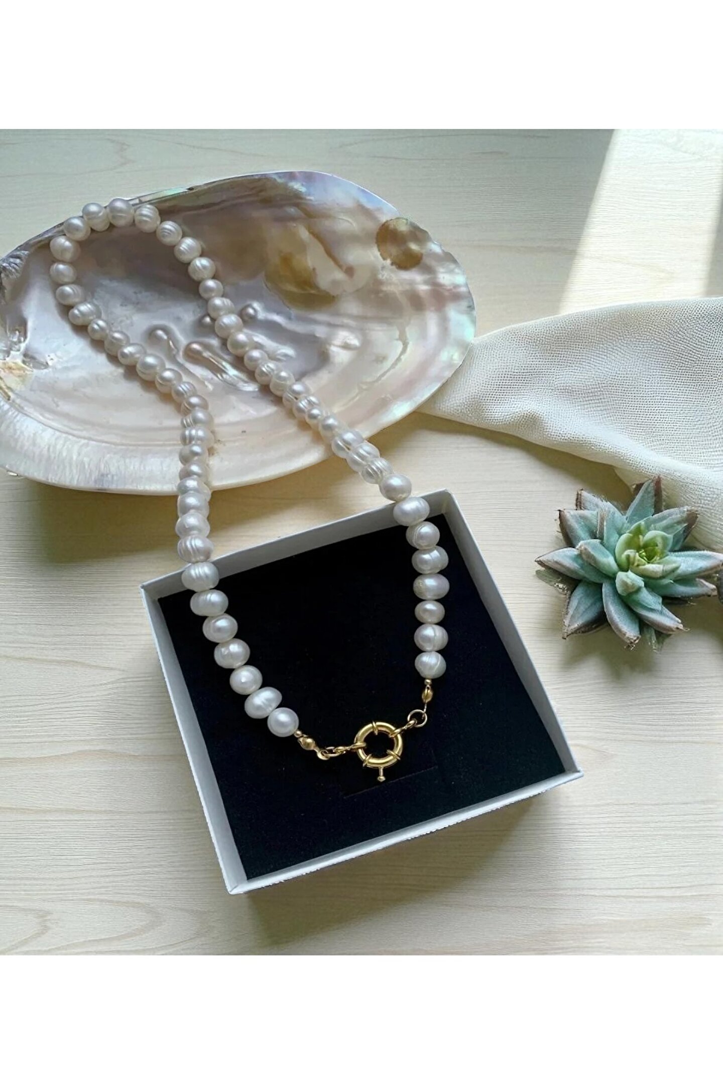 Kolye uzunkuğu: 55 cm ; Uzatma zinciri yoktur, full incidir.; ; 7-8mm gerçek inciler, çelik bağlantı aparatları kullanılarak hazırlanmıştır.; Gemici kilit altın kaplamadır.; ; Doğal parlaklığı ve eşsiz yapısıyla her parça kendine özgüdür.; ; Özel Tasarım – Günlük kullanıma ve özel günlere uygundur.; ; El Yapımı & Özenle Üretilmiştir ; Taşmir İncilerini Uzun Süre Kullanmanız İçin: ; -Su, parfüm ve kimyasallardan uzak tutunuz.; ; -Kullanmadığınızda kendi kutusunda muhafaza ediniz.; ; -Nazikçe temizleyerek ışıltısını koruyabilirsiniz ;