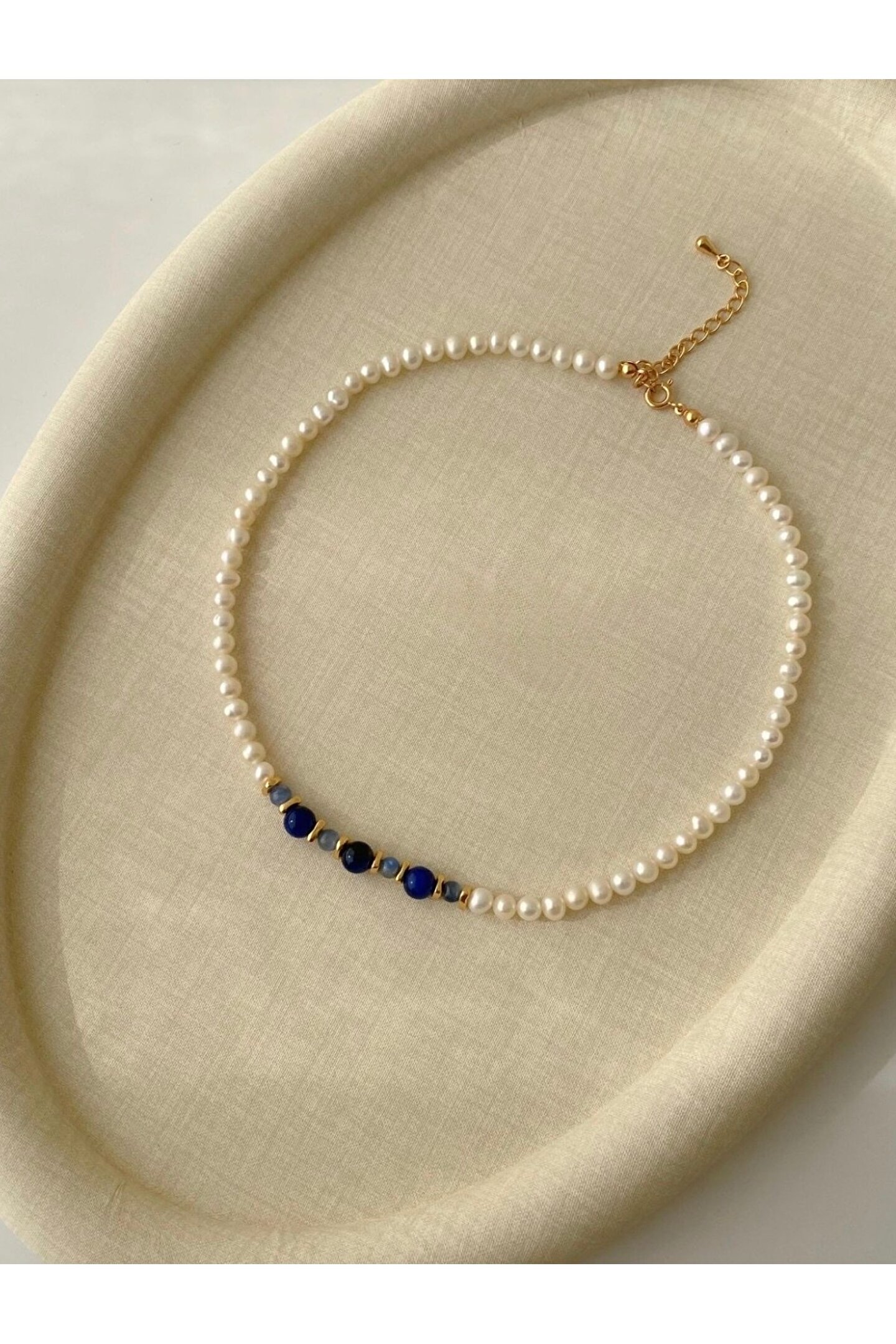 Sertifikalı gerçek inci ve lapis lazuli tasarım kolye.; Kolye uzunluğu 40 cm + 5-6 cm uzatma zinciri;Kullanılan materyal: Paslanmaz Çelik;Kullanılan taş boyutu: 4 mm inci - 6 ve 4 mm Lapis Lazuli;