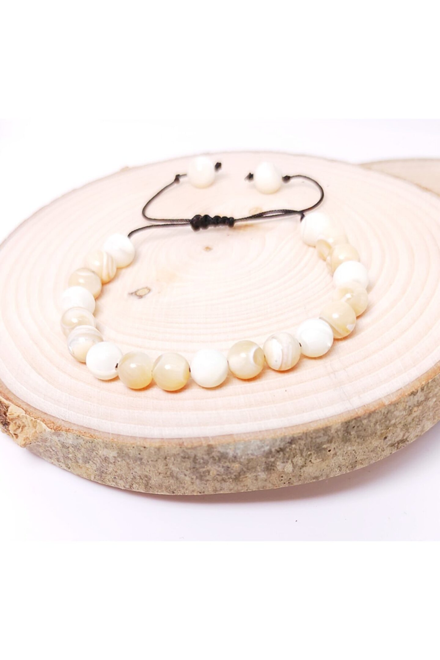Doğal sedef taşı kullanılarak üretilmiş, şıklığı ve doğallığı bir arada sunan bileklik; 7 mm kalınlığındaki bu bileklik, zarif tasarımıyla dikkat çeker ve her türlü kıyafetle uyum sağlar; Doğal taş materyali sayesinde her bileklik benzersizdir ve her kullanımda farklı bir görünüm sunar; El yapımı olması, ürünün otantik ve özgün bir hava katmasını sağlar;