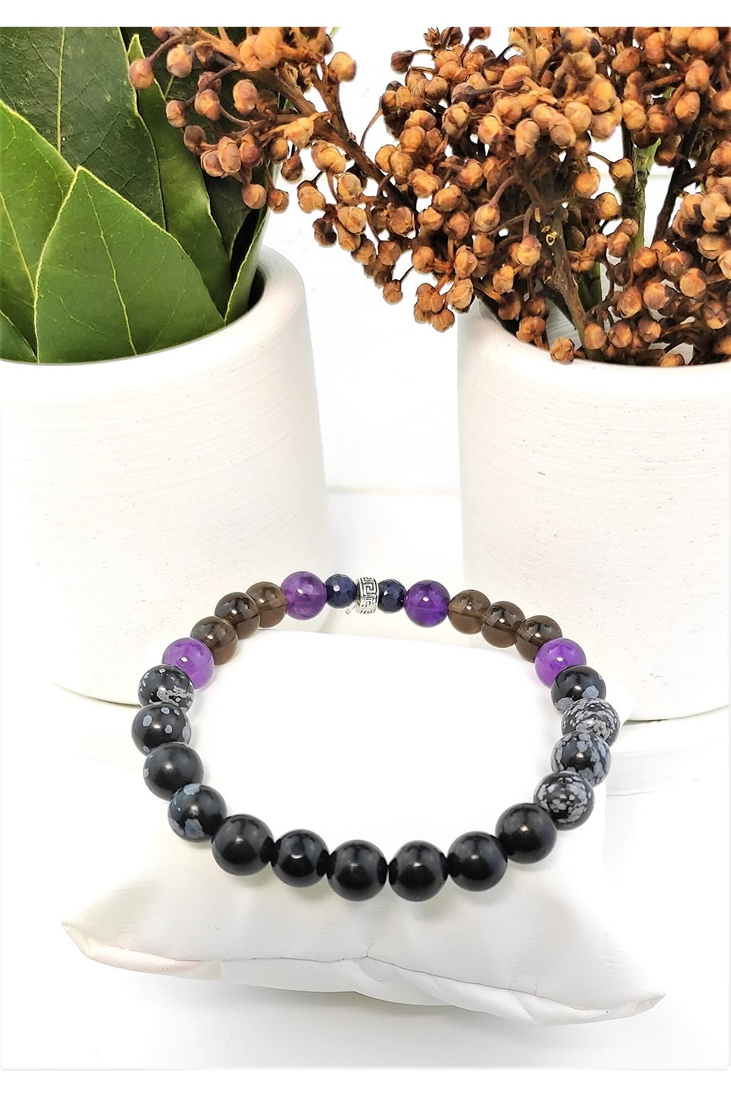 Doğal taş kullanımı sayesinde her bileklik benzersiz ve otantik bir görünüm sunar; Siyah turmalin kartanesi, obsidyen, ametist ve dumanlı kuvars gibi değerli taşlarla zenginleştirilmiş bu bileklik, şıklığınızı tamamlar; Lacivert safir taşı ile göz alıcı bir parlaklık ve renk derinliği sağlar, her türlü kıyafetle uyum içinde olur; Doğal taş materyaliyle hem dayanıklılık hem de estetik bir dokunuş sunar; uzun süreli kullanım için idealdir;