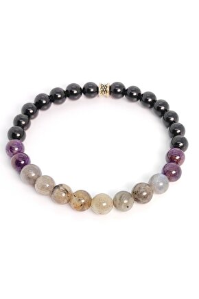 Doğal taş kullanımı sayesinde her bileklik benzersiz ve otantik bir görünüm sunar; Siyah turmalin labradorit ametist taşı, şıklığı ve zarafeti bir arada barındırır; Bu bileklik, hem günlük kullanım hem de özel günler için ideal bir aksesuar seçeneği olarak öne çıkar; Doğal taşların eşsiz dokusu ve renk tonları, her kıyafetle uyum sağlayarak stilinizi tamamlar;