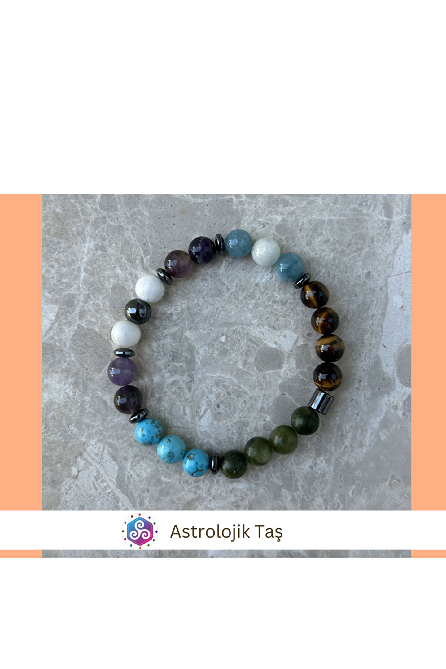 Migren ve Baş Ağrısı Bilekliğinde Ametits, Kaplan Gözü, Yeşim Taşı,Akumarin, Turkuaz Firuze Taşı, Ay Taşı kullanılmıştır. Doğal Taş uzmanlarımızve Astroloğumuzun tavsiye ettiği taşlardır.