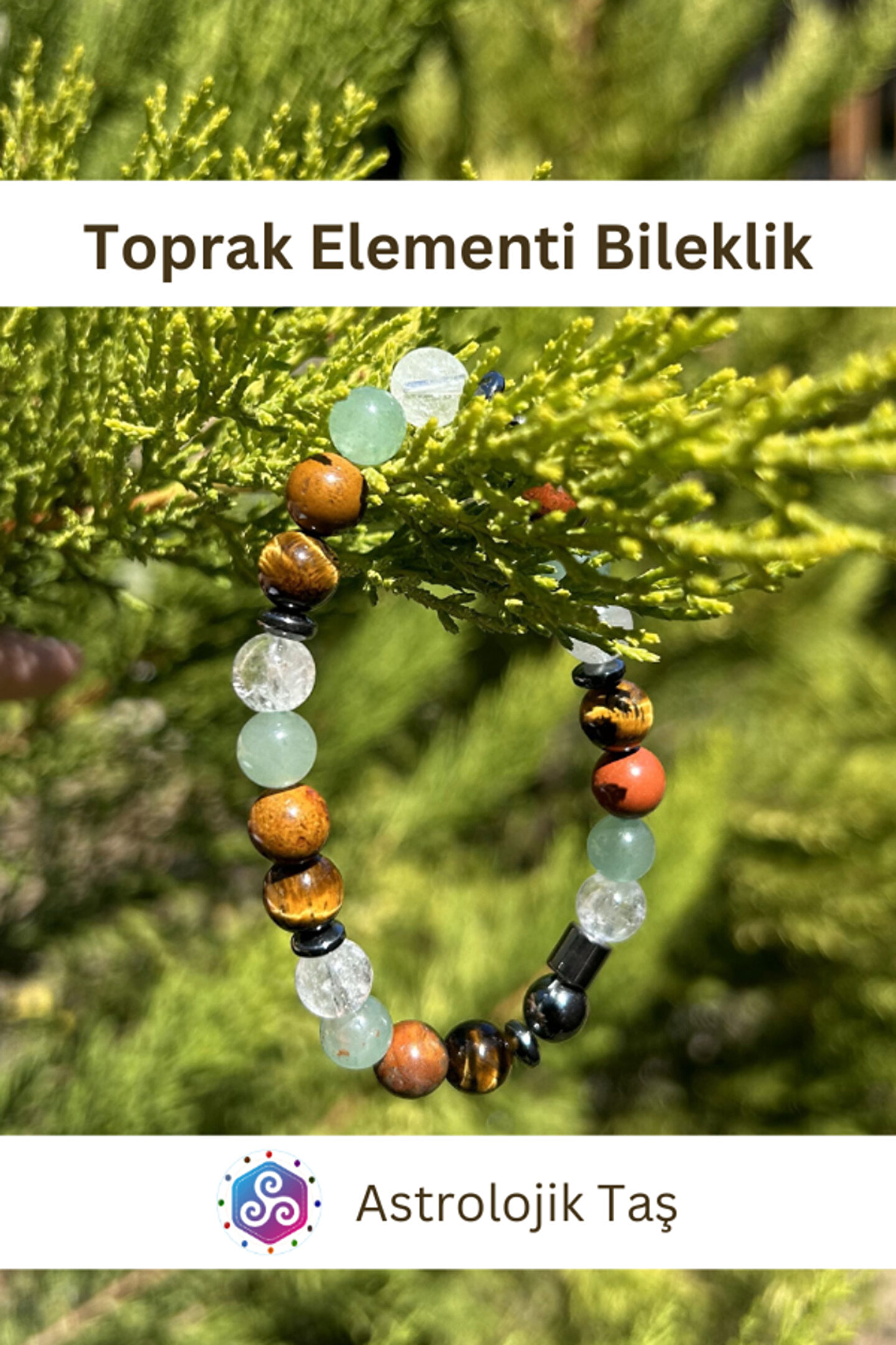 Toprak Elementi Bilekliğinde Kaplan Gözü, Aventurin, Jasper ve KristalKuvars kullanılmıştır.