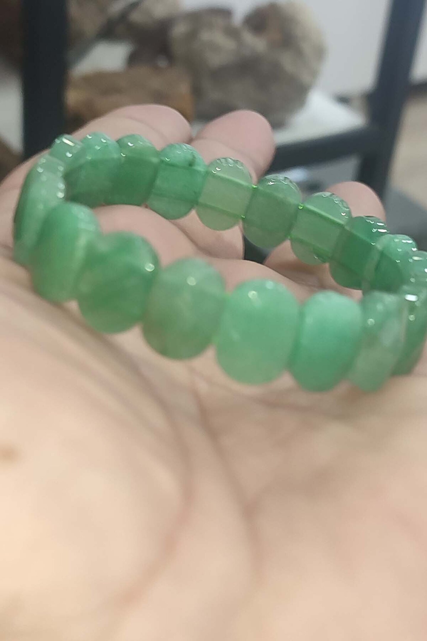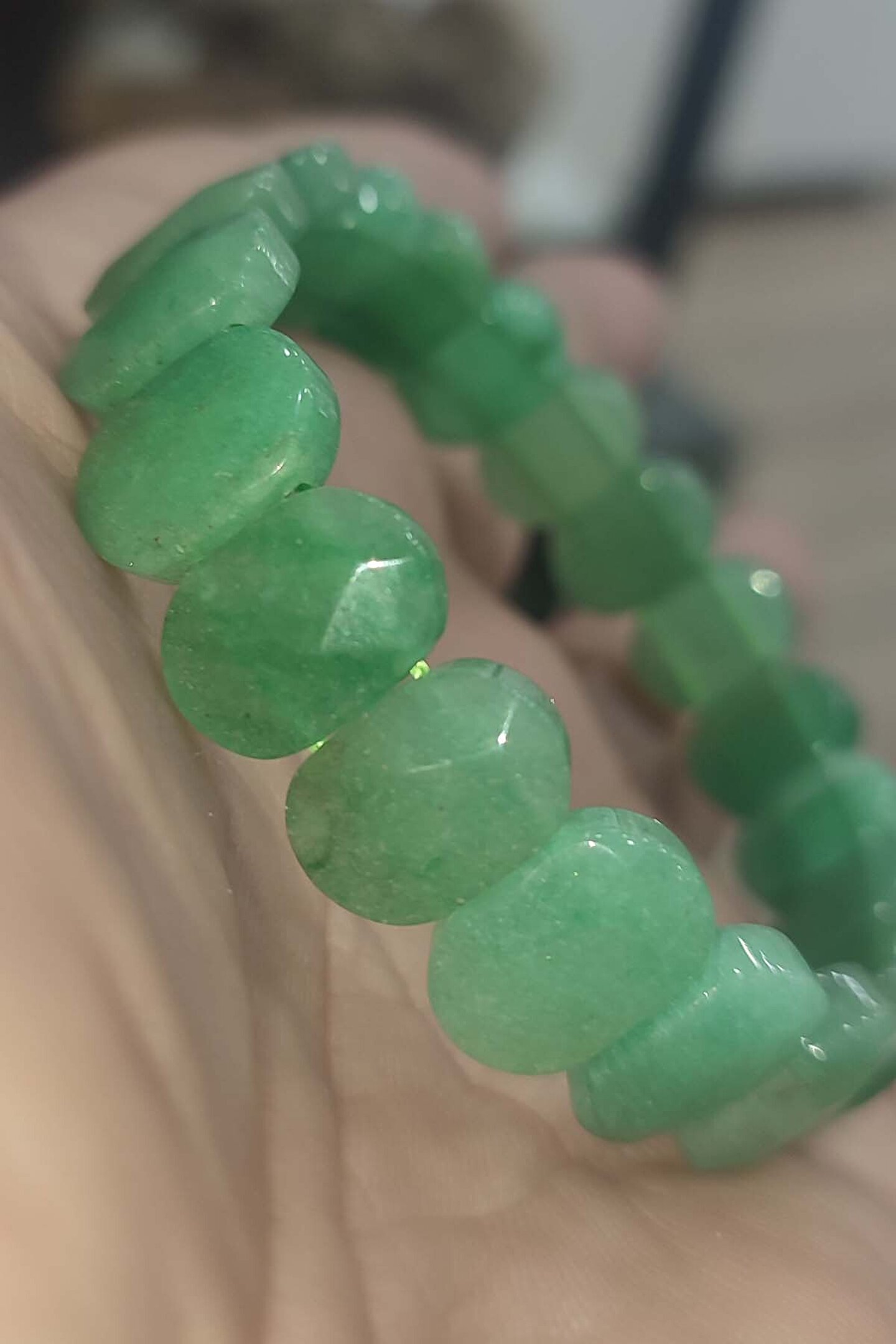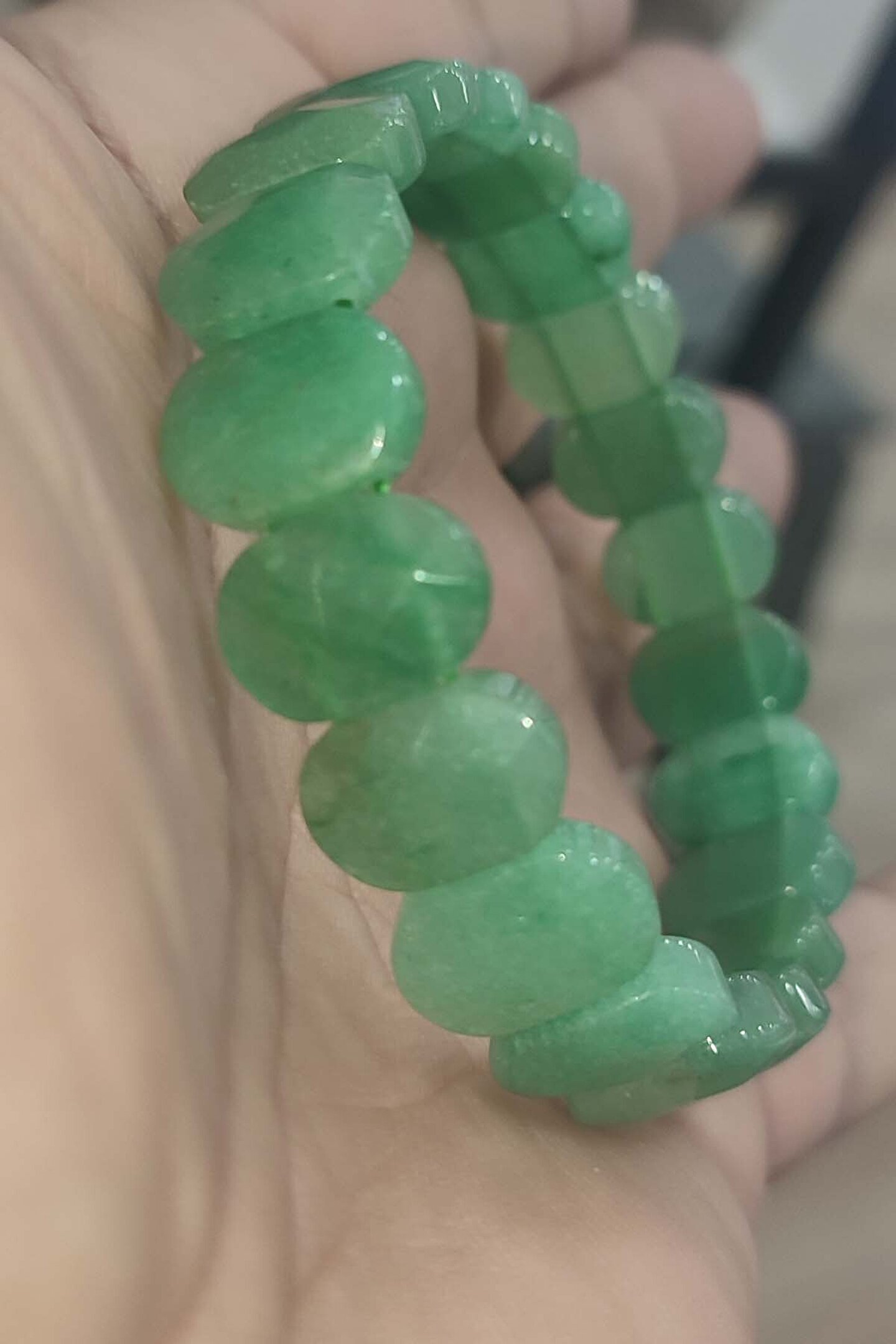 - Doğal Aventurin taşı kullanılarak üretilmiş, her biri benzersiz ve özgün bir görünüm sunar; - Faset kesim tekniği ile işlenmiş taşlar, ışığı mükemmel bir şekilde yansıtarak göz alıcı bir parlaklık sağlar; - Bileklik, zarif tasarımıyla hem günlük kullanım hem de özel günlerde şıklığınızı tamamlar; - Doğal taşların sıcaklığını ve doğallığını bileğinizde hissedin; her anınıza eşlik edecek bu bileklik, stilinizi öne çıkarır;