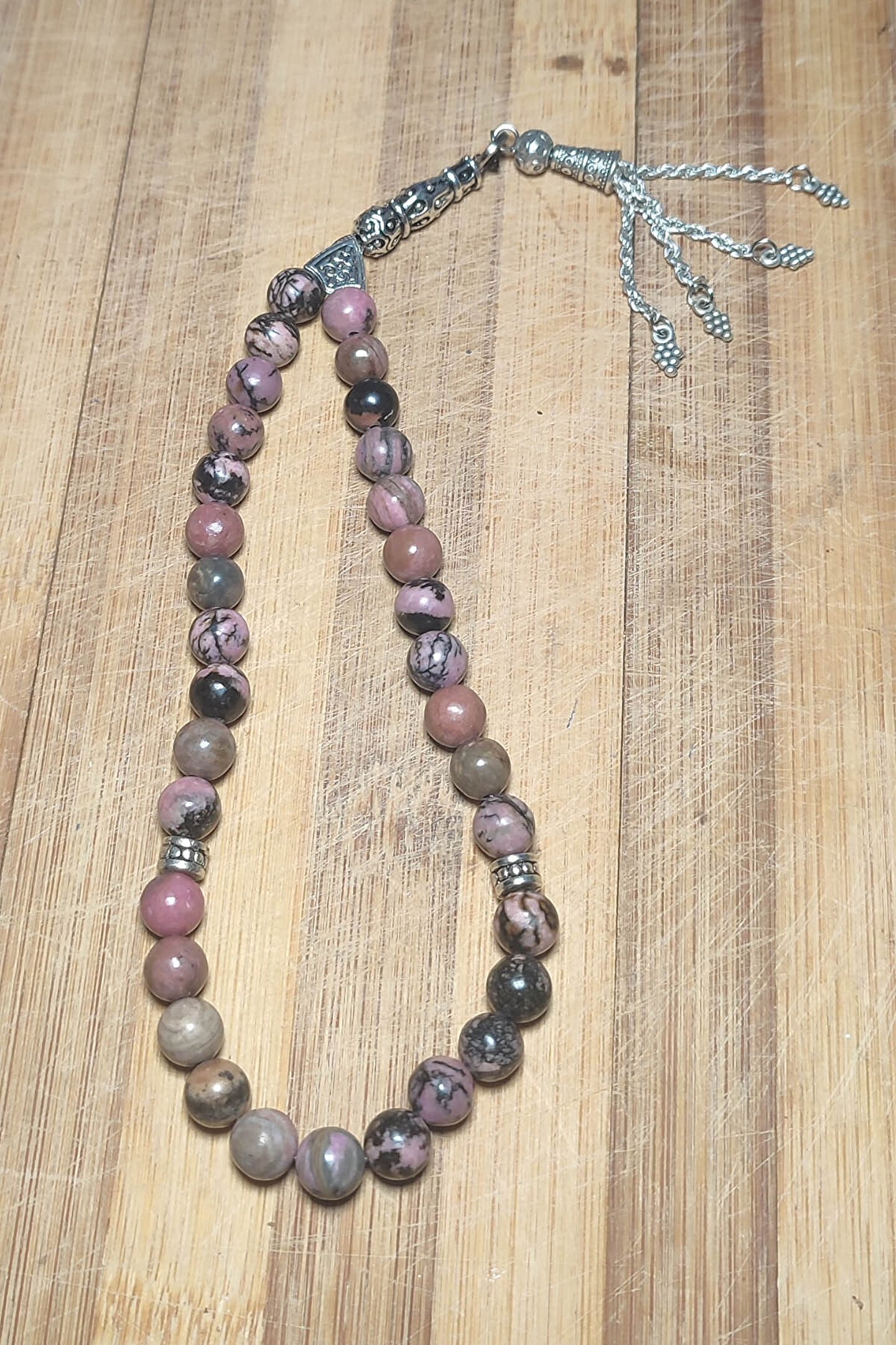 Doğal Rodonite taşı kullanılarak üretilmiş, her bir tesbih tanesi el işçiliği ile özenle işlenmiştir; Krom materyal detayları ile zenginleştirilmiş, şık ve modern bir görünüm sunar; Tesbihin her bir taşı, benzersiz desenleri ve renkleriyle göz alıcı bir estetik sergiler; Doğal taşların sıcaklığını ve zarafetini yansıtan bu tesbih, özel günlerinizde veya günlük kullanım için idealdir;