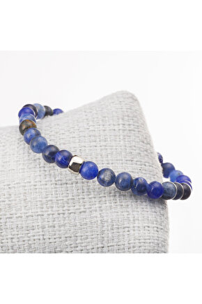 Doğal Sodalit taşı kullanılarak üretilmiş, şıklığı ve doğallığı bir arada sunan bileklik; 6 mm boyutundaki zarif tasarımıyla, her türlü kıyafetle kolayca uyum sağlar ve stilinizi tamamlar; Doğal taş materyali sayesinde her bileklik benzersiz ve eşsiz bir görünüm kazanır; her biri farklı renk ve desenlerde olabilir; Sodalit taşı, enerji taşı olarak bilinir ve pozitif enerjiyi yansıtarak gün boyu kendinizi daha huzurlu ve motive hissetmenizi sağlar;