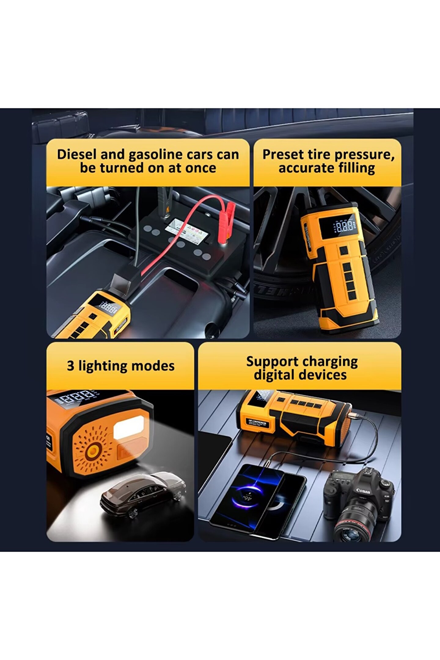 **Özellikler** - Güçlü araba atlama başlatıcısı: 600A etkileyici bir tepe akımı ile bu cihaz hızla 3.5L gaz motoruna kadar 12V araç başlatabilir.; Arabalar, SUV'lar, kamyonlar, kamyonetler, motosikletler veya tekneler için idealdir.; - LED acil durum ışıkları: Hem aydınlatma hem de acil durum sinyalleri için üç mod (güçlü ışık/SOS/flaş) içeren yerleşik bir LED el feneri ile donatılmıştır.; - Taşınabilir Güç Bankası: 10000mAh kapasiteye sahip olan bu çok fonksiyonlu güç bankası, telefonunuzu, tabletinizi veya diğer USB cihazlarınızı hareket halindeyken zahmetsizce şarj etmenizi sağlar.; - Çok fonksiyonlu hava pompası: 150psi hava pompası lastik enflasyonu için 40L/dakikaya kadar hava akışı sağlarken, dijital ekran basınç izlemeyi basitleştirir.; - Taşınması Kolay: Kompakt ve hafif tasarım kolay taşıma ve depolamayı kolaylaştırır.; Açık hava maceraları ve günlük acil durumlar için bir zorunluluktur.; ** Özellikler ** - Malzeme: ABS - Nominal Voltaj: DC 14.8V - Silindir çapı: 22mm - Şarj Yöntemi: T Tip Kablosu - Nominal Güç: 75W - gürültü seviyesi: ≤84dB - Çalışma sıcaklığı: -20 ℃ ila +60 ℃ - Pil Kapasitesi: 10AH - Nominal Giriş: 5V/2A - USB çıkışı: 5V/1A - Başlangıç akımı: 200a - Pik akım: 600A - Hava Pompası Gücü: 60W - Ürün Boyutu: 180 * 80 * 55mm / 7.08 * 3.15 * 2.16in ** Paket içerir ** - Jump Starter Power Bank - Hava pompası - Type-C şarj kablosu - Kullanım Kılavuzu ** Uyarılar ve Tavsiye ** Bu cihazı şarj etmeyi ve serin ve kuru bir yerde sakladığınızdan emin olun.; Herhangi bir aşınma veya hasar belirtisini düzenli olarak kontrol edin ve optimum kullanım için Kullanım Kılavuzunda verilen tüm talimatları izleyin.;