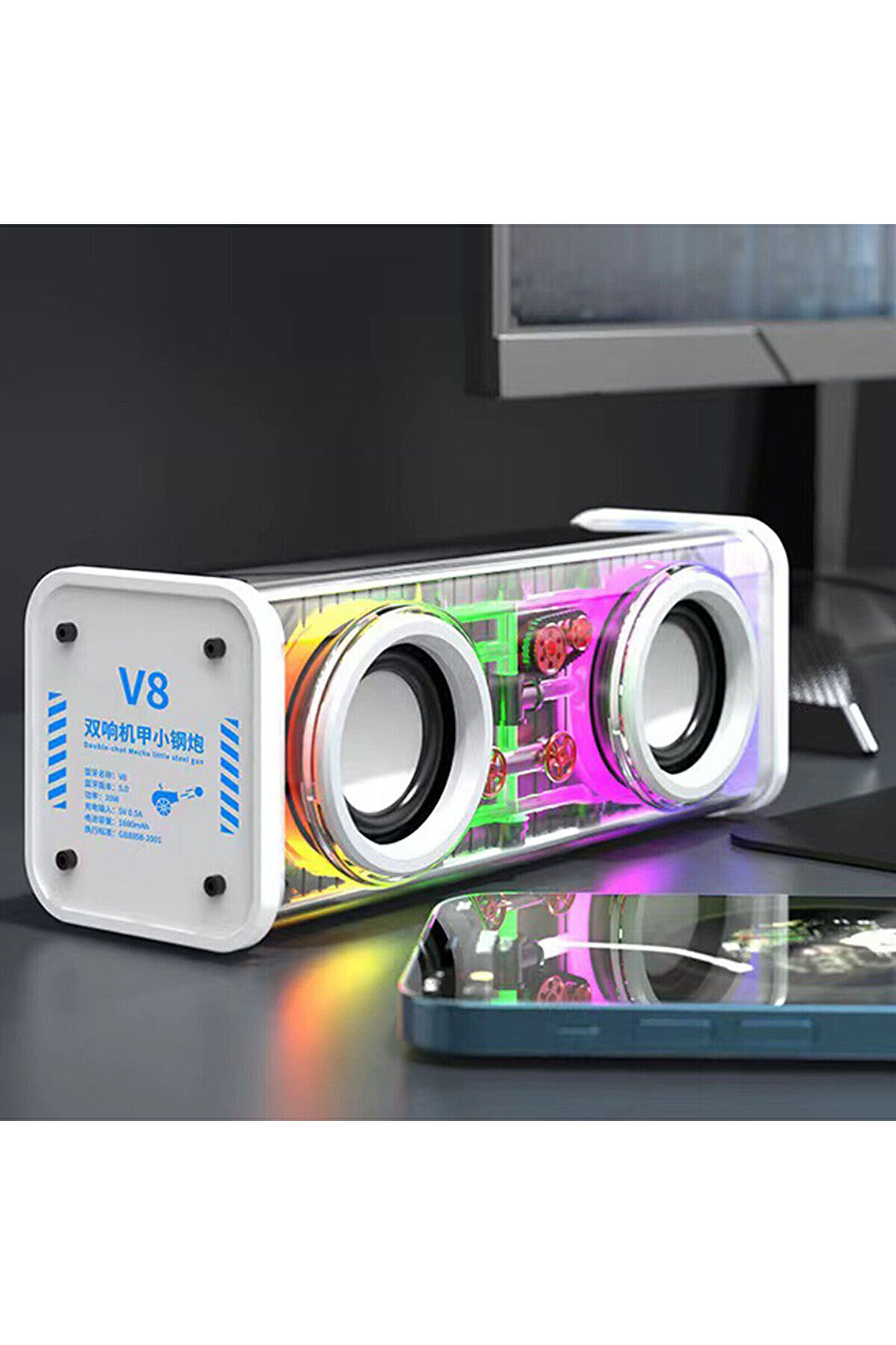 1. ; Malzeme: ABS 2. ; Bluetooth sürümü: V5.0 3. ; Çalışma mesafesi: 10m 4. ; Frekans yanıtı: 50Hz-18khz 5. ; Pil kapasitesi: 1800mAh 6. ; Şarj süresi: 2 saat 7. ; Çalma süresi: 2-3 saat 8. ; Hoparlör gücü: 5Wx2 9. ; Bluetooth 5.0 sürümü, bağlantıyı daha sorunsuz, hızlı ve kararlı hale getirir 10. ; Şeffaf mecha kabuğu, teknolojinin sesini hissedin, zarif ve şık 11. ; 10W yüksek güçlü çift hoparlör, 360 derece stereo ses, farklı keyif 12. ; Renkli hayalet flama, yüksek değerli görünüm, havalı ve cömert Ambalaj listesi: Bluetooth hoparlör X1, USB kablosu X1, ses kablosu X1, kullanım kılavuzu X1;