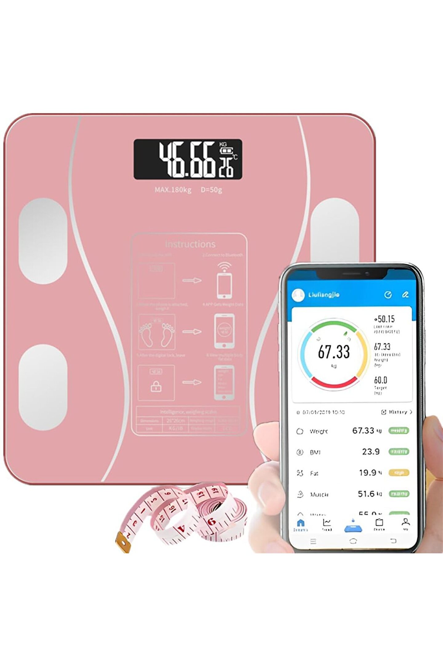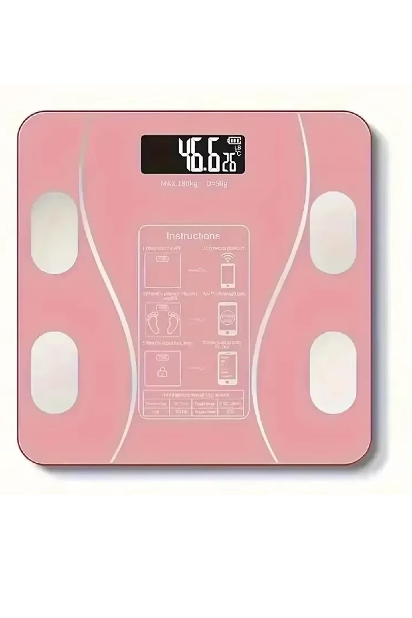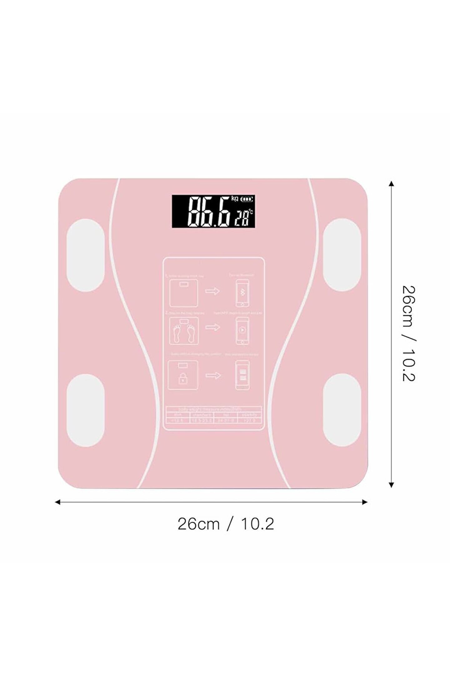 Özellik: Çoklu vücut verilerini ölçün ve tüm vücut değişikliklerini öğrenin Otomatik güç açma ve otomatik kapanma olarak adlandırılan akıllı algılama R10 anti-çarpışma yuvarlak köşeler, kaymaz ve anti-rollover Kapalı sıcaklık algılama, Bluetooth uyumlu APP tek bir tıklama bağlantısı.; Şartname: Ölçek çerçeve malzemesi: ABS plastik taban Panel malzemesi: patlamaya dayanıklı temperli cam Ürün boyutu: 260*260*23mm/10.23*10.23 * 0.9in Ekran boyutu: 58*23mm/2.3 * 0.9in Ekran modu: LCD HD mavi ekran Tedarik yöntemi: pil tipi 2 * AAA (dahil değildir) Tartım aralığı: 0.2-180kg Ekran ünitesi: kg/lb/st dönüşüm Sensör: son derece hassas sensör Ek fonksiyonlar: sıcaklık, güç göstergesi, Bluetooth uyumlu fonksiyon