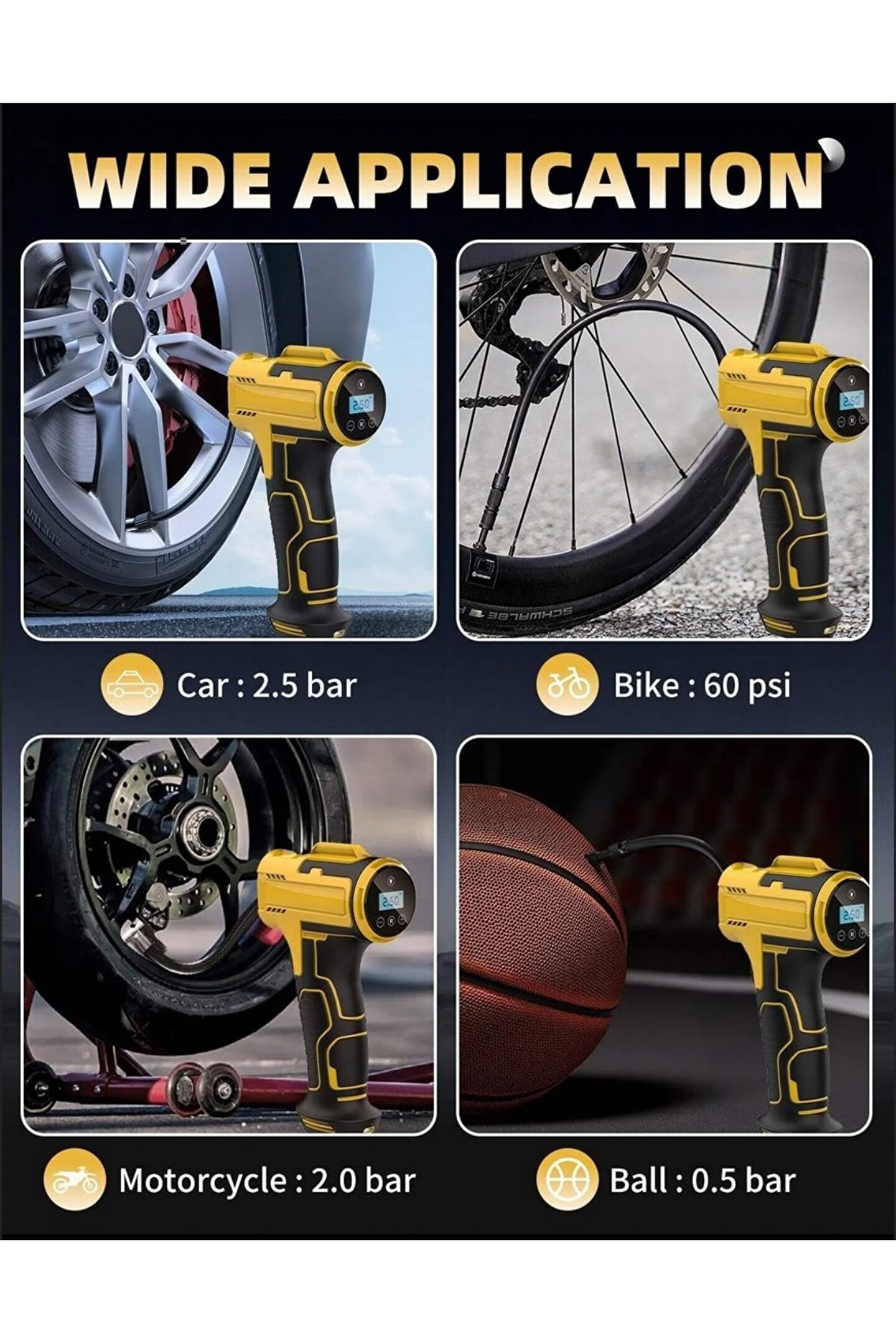 UZUN ÇALIŞMA SÜRESI VE OTOMATİK KAPANMA: Tamamen şarj olduktan sonra, dahili 3600mAh büyük kapasiteli pil, otomobil lastiği pompasının 30-36PSI'dan 8 lastiğe (195 / 65R15) kadar doldurmasını sağlar. Ön ayar işlevi ve otomatik kapanma işlevi, eller serbest bir şişirme deneyimi sunar. Akülü lastik şişirici, tek bir basışla araba lastiklerini, motosiklet lastiklerini, bisiklet lastiklerini, topları ve daha fazlasını kolayca şişirir. (Not: Arazi araçları, karavanlar, kamyonlar ve römorklar gibi ağır hizmet lastikleriyle uyumlu değildir.)