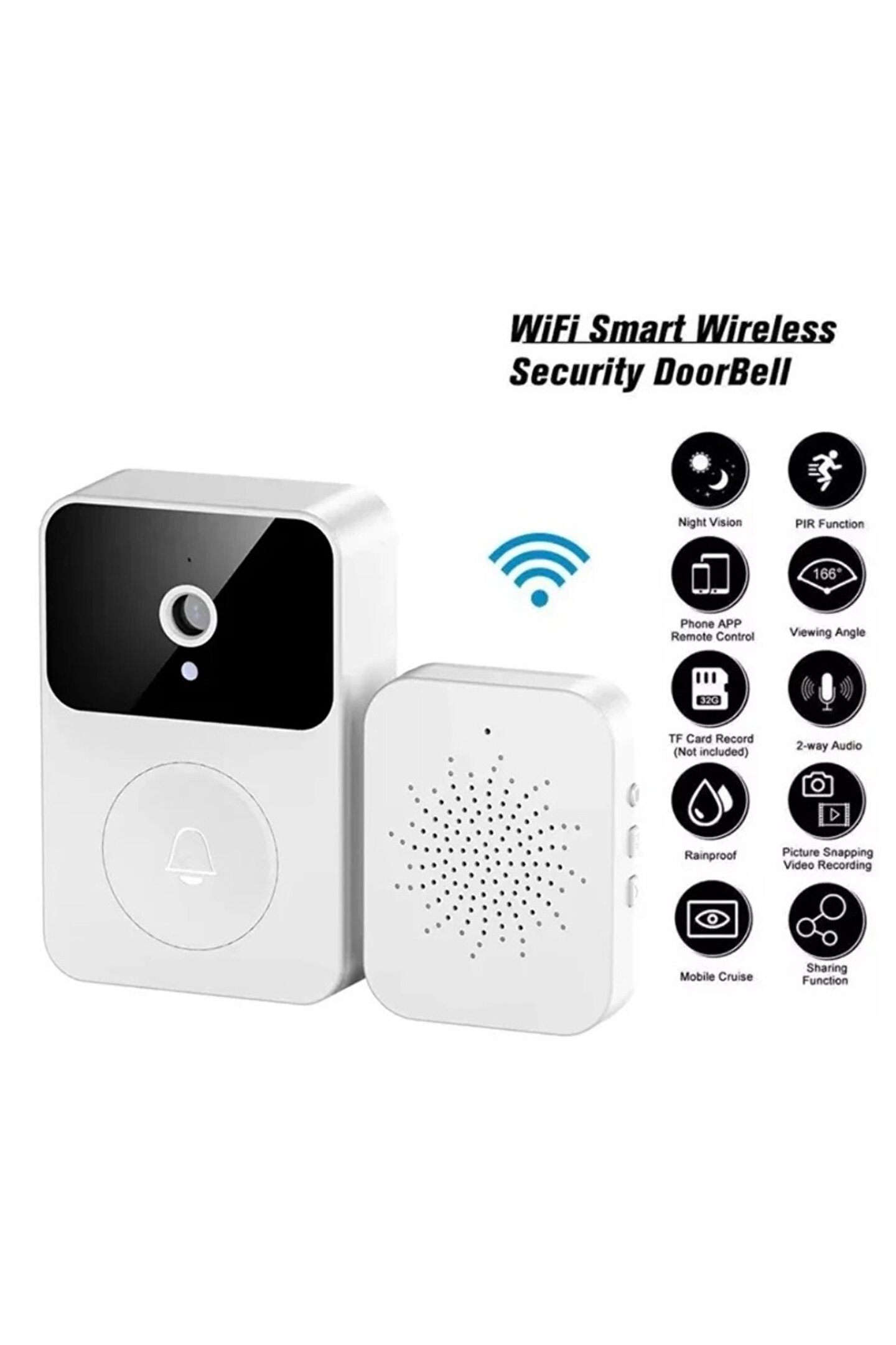 X9 Akıllı Kablosuz Wifi Görüntülü Kapı Zili Su Geçirmez 1080 P HD Video Kapı Zili Kamera Ile HD Kızılötesi Gece Görüş Interkom KameraX9 Akıllı Kablosuz Görüntülü Kapı Zili Akıllı Güvenlik Kamerası Kapı Zili WIFI Kablosuz Uzaktan Ev Video Monitörü Interkom Kamera Tanım:Ürün boyutu: 15.5*6.8*3.5cmÜrün ağırlığı: 85gÜrün Adı: Akıllı Kapı ZiliÜrün malzemesi: ABSÖzellikler:1, Hareket algılamaPIR piroelektrik kızılötesi sensörle yapılandırılmış olan kamera, birinin geçtiğini tespit ettiğinde, size hemen APP aracılığıyla bir uyarı mesajı gönderecektir. 2, Gece görüş fonksiyonuGüçlü gece görüş fonksiyonuna sahip ICR kızılötesi filtreyi kullanma; 166° ultra geniş açılı lens, kapının her ayrıntısını görün 3, gerçek zamanlı interkom fonksiyonu; 1080P tam HDMisafirler ziyaret ettiğinde, evde olmasanız bile, uygulama aracılığıyla gerçek zamanlı ekranı ve gerçek zamanlı sesli interkomu görüntüleyebilirsiniz. 4, çift güç kaynağı, uzun ömürLityum pil güç kaynağı modunu kullanabilir, kablolama gerektirmez, basit kurulum; Aynı zamanda güç adaptörü şarjını da destekleyerek sık sık pil değiştirme sorununu ortadan kaldırır 5, düşük pil istemiUygulamada düşük pil uyarısını ayarlayabilirsiniz, eşik ayar aralığı %10 - %50'dir, güç ayarladığınız eşikten düşük olduğunda size APP aracılığıyla bir hatırlatma gönderir 6, yerel ve bulut depolamaFotoğraf ve video kaydını destekleyin (SD kart gerekmez), 7 günlük ücretsiz bulut depolama hizmeti sağlayın, daha fazla zaman istiyorsanız lütfen satın alın. 7, 30 saniyeye kadar sesli mesaj fonksiyonuEn fazla 3 sesli mesaj, her mesaj en fazla 10 saniye; Mesajları kapı ziline önceden kaydedebilirsiniz. Uygun olmadığınızda ziyaretçilere hızlı yanıt 8, Çoklu kullanıcı işleviCloudedge Uygulaması çok kullanıcılı grup paylaşımını destekler, tüm aile üyeleri gözetim videosunu görüntüleyebilir.Not: Yalnızca yöneticinin menüyü ayarlama hakkı vardır, diğer üyeler yalnızca videoyu görüntüleyebilir ve oynatabilir. 9, zil sesiyle eşleştirilebilirBu zilde 4 zil sesi ve 100dB'e kadar 3 ayarlanabilir ses seviyesi (sessiz mod dahil) bulunur ?Ses değiştirme interkomu, Saniyeler Amca olur?:Garip ziyaretçilerle uğraşmak kolaydır!Ses değiştirme işlevini yükseltin. Evde yalnız olduğunuzda, ses değiştirme interkom fonksiyonunu kullanabilirsiniz Orijinal ses desteği, amca 2 ses modu isteğe bağlıdır Paket içeriği:1 * kapı zili1 * Kullanım Kılavuzu1 * Şarj kablosu