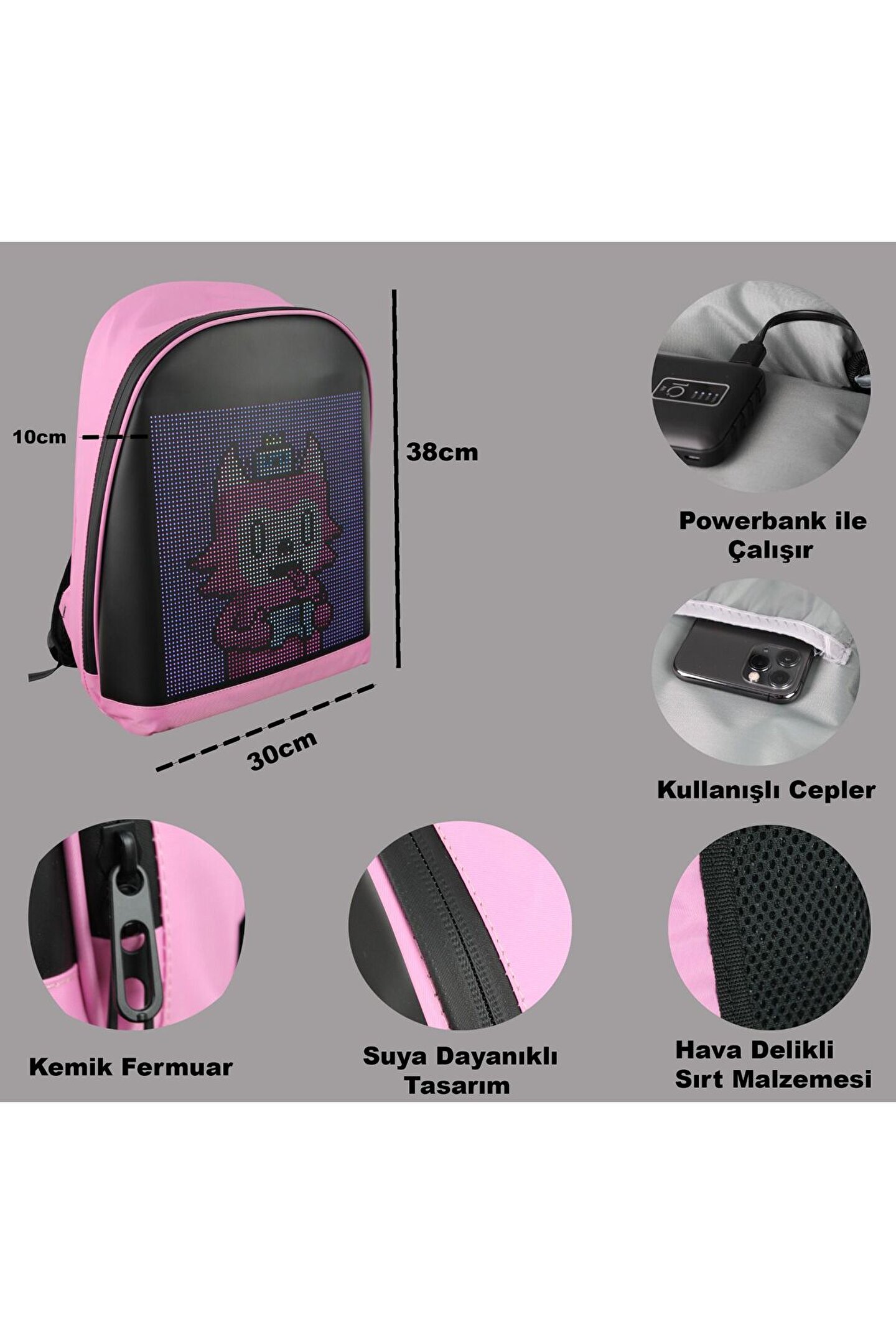 • Çantanın led ekranı bir powerbank ile çalışır. (powerbank ayrı satılır.)
