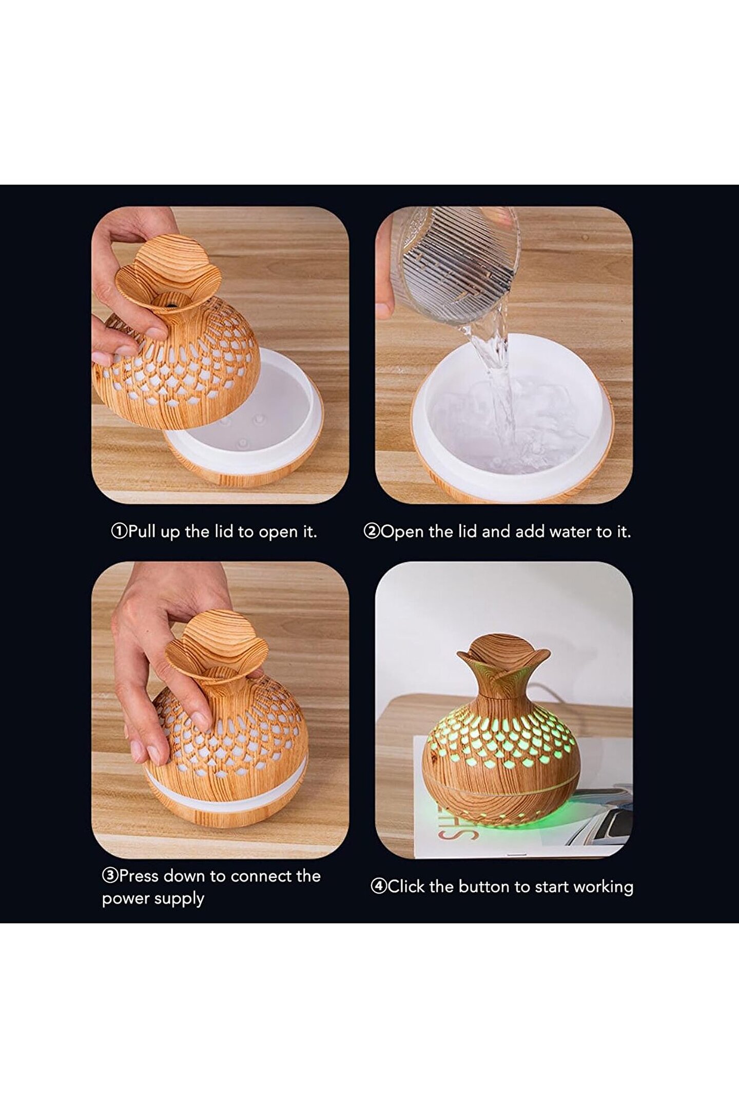 Ürün Açıklaması 1. [Büyük Su Deposu] 300 ml kapasite, sık doldurmadan uzun süreli nem sağlar.; 2. [Güçlü Nemlendirme] Nemlendirici, saatte 30-50 ml ferahlatıcı sağlar, iç mekan kuruluğunu .; 3. [Odun Tanesi Tasarımı] Şık ahşap taneli tasarım, yaşam alanınıza zarafet katar.; 4. [Sessiz Çalışma] Sakin bir şekilde çalışan çiçek vazo şeklindeki nem cihazı ile huzurlu bir ortamın tadını çıkarın.; 5. [USB GÜÇLÜ VE PORTABLE] Rahat USB güç sayesinde çeşitli ayarlarda taşıması ve kullanımı kolaydır.; Teknik özellikler: Ürün Türü: Nemlendirici Malzeme: ABS + PP + elektronik bileşenler Kullanım: Difüzör Anma gerilimi: 5V Çalışma akımı: 300-450mA Güç: 2,5W Su tankı kapasitesi: 300 ml Püskürtme hacmi: 30-50 ml/H Brüt ağırlık: Yaklaşık 219 G/0,5 lb Pakettekiler listesi: 1 x Aromaterapi difüzörü (gövde + üye) 1 x USB kablosu.; 1 x Kullanım Kılavuzu 1 x pamuk çubuk.;