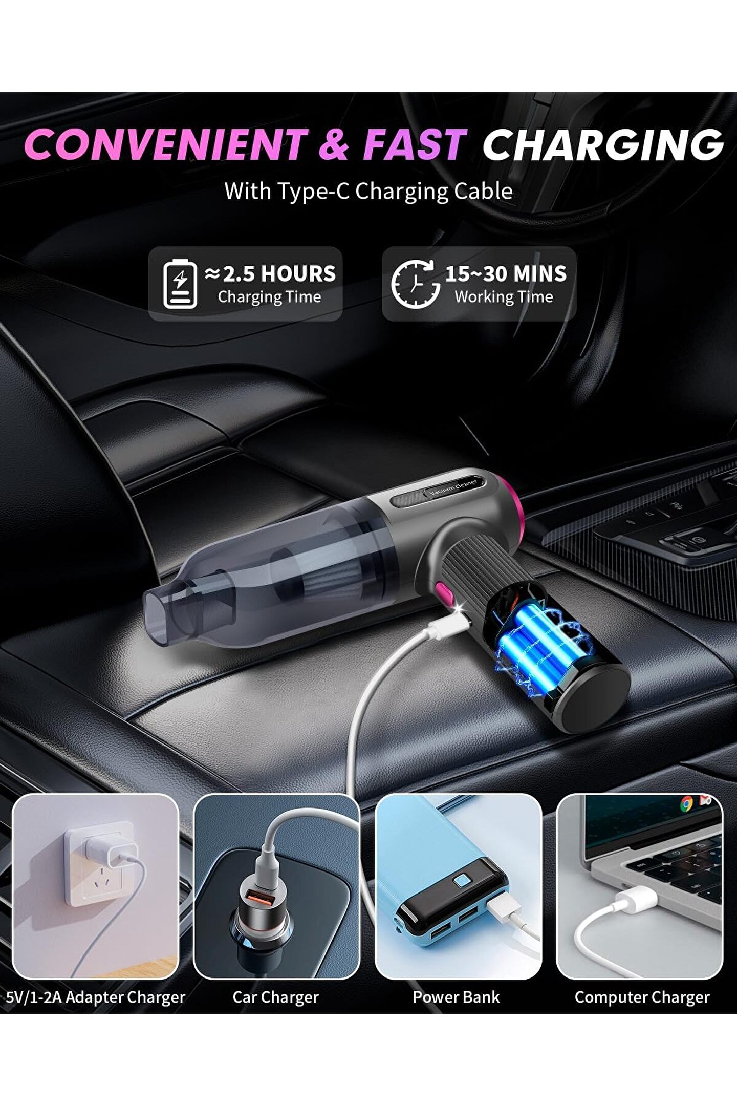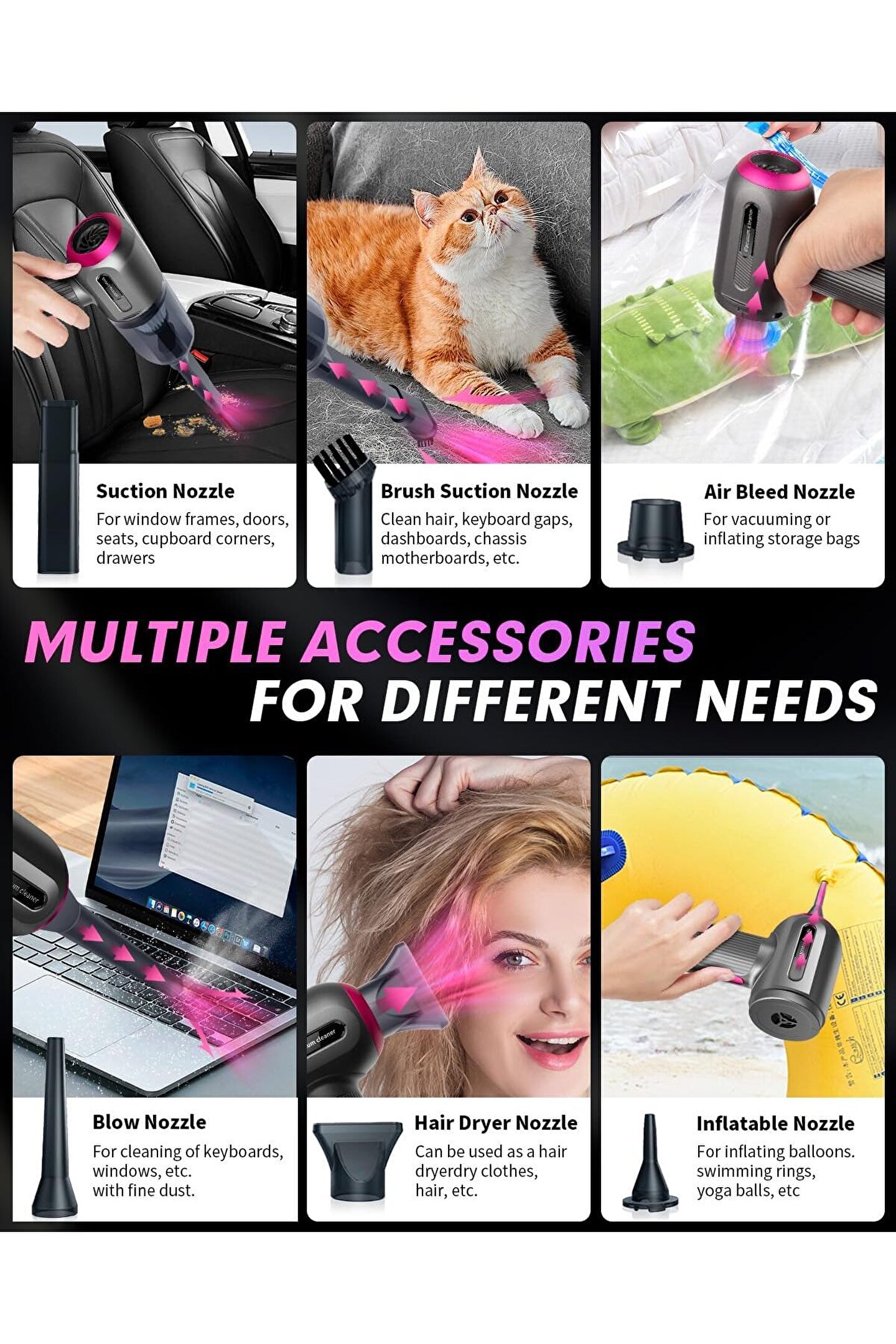 6 temizleme aksesuarıyla bu elektrikli süpürge, eviniz ve arabanız için çok amaçlı bir alete dönüşür. Emme ve üfleme ağızlıklarına ek olarak, şamandıraları şişirmek için bir şişirme ağzı, saç kurutma işlevine sahip bir ağızlık içerir ve hatta saklama torbaları için vakum pompası görevi de görebilir. Temizlik ihtiyacınız ne olursa olsun işinizi kolaylaştıracak bir aksesuar mutlaka vardır.