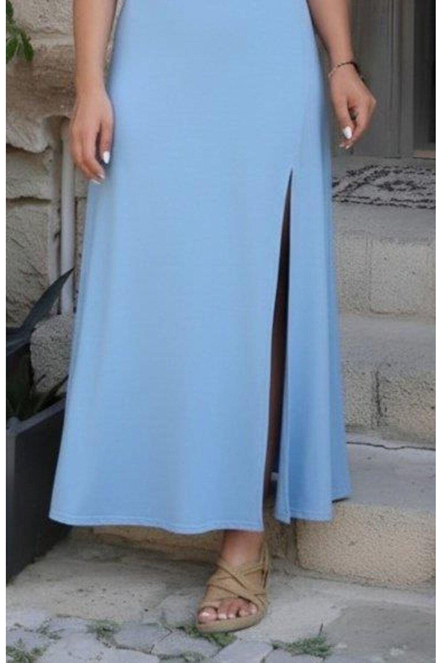 TBL DEKOR Kadın Askılı V Yakalı Yırtmaçlı Uzun Viskon Elbise