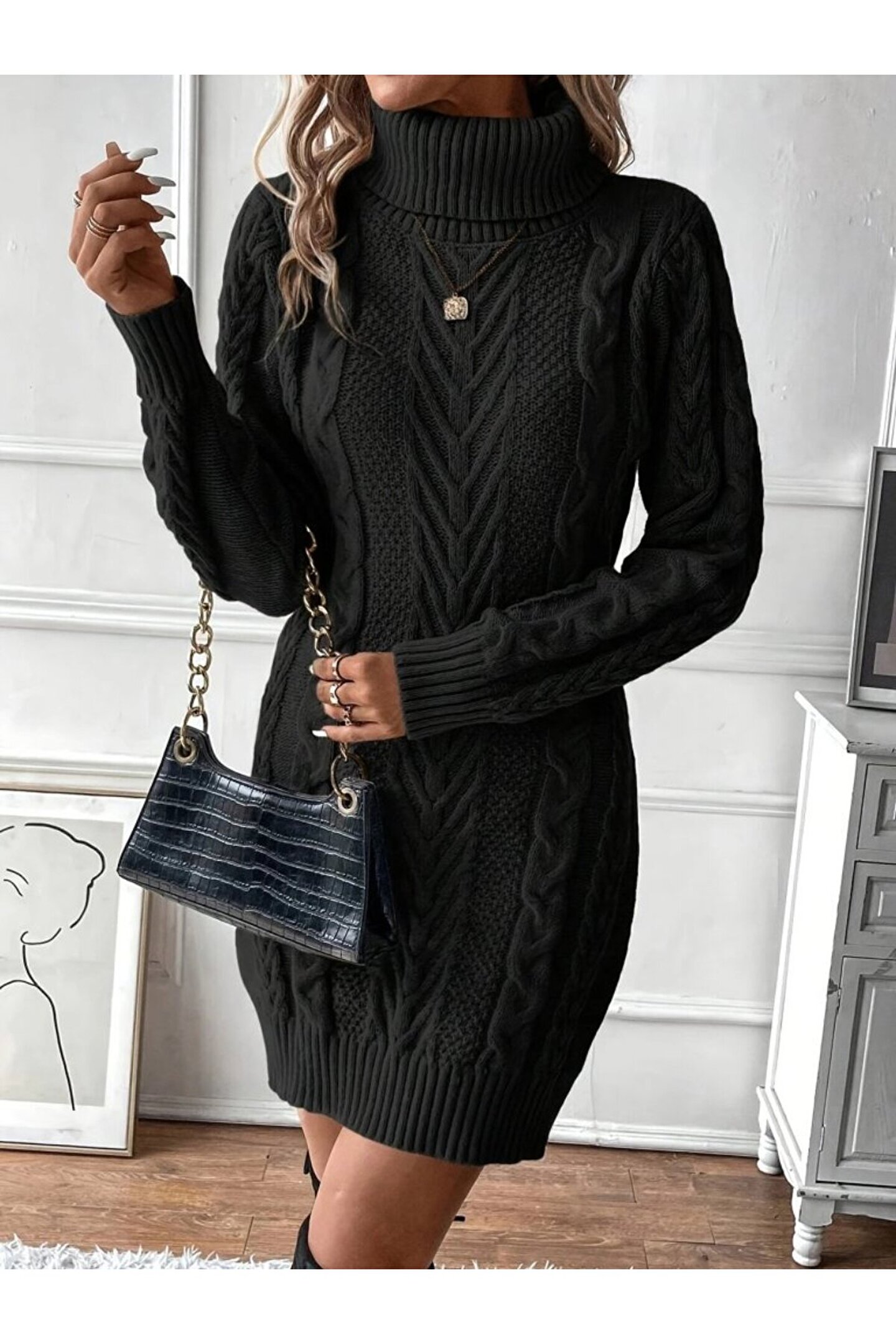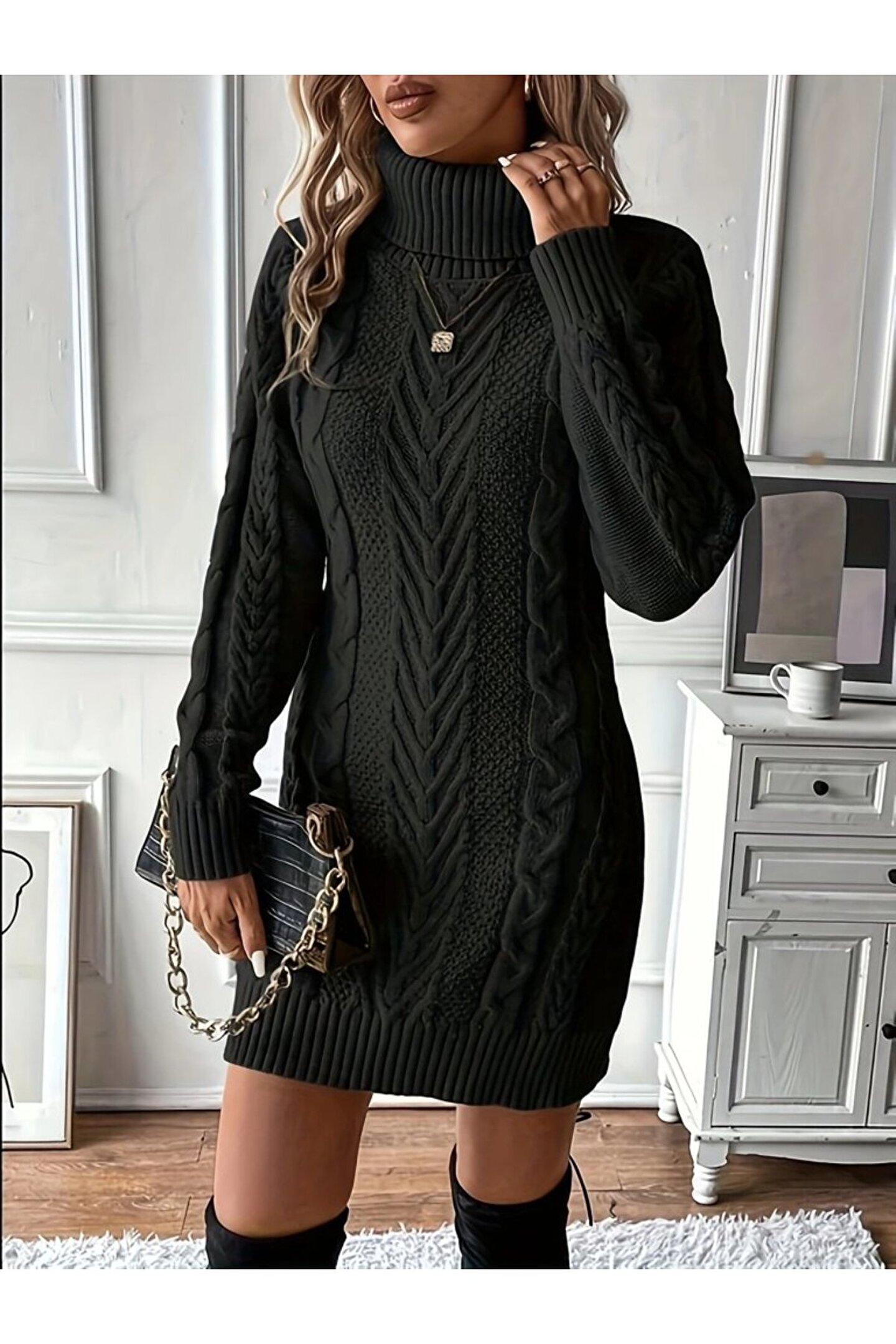 TBL DEKOR Kadın Balıkçı Yaka Mini Triko Elbise