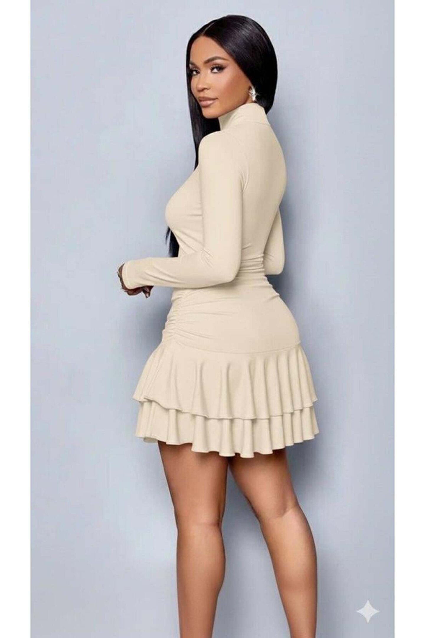 TBL DEKOR Kadın Uzun Kollu Balıkçı Yaka Mini Fırfırlı Sandy Elbise