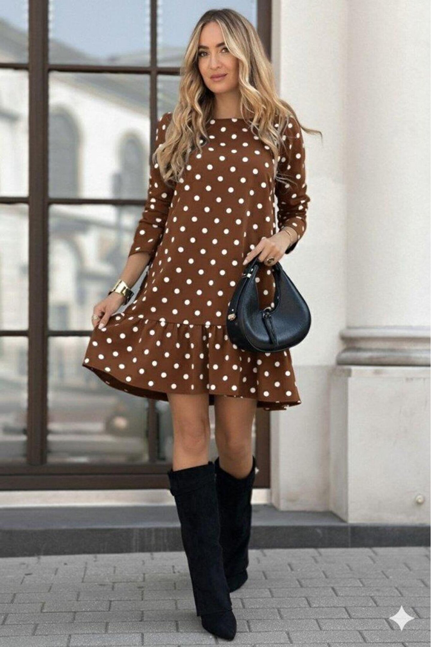 Kadın Uzun Kollu Bisiklet Yaka Fırfırlı Puantiyeli Kısa Modal Elbise
