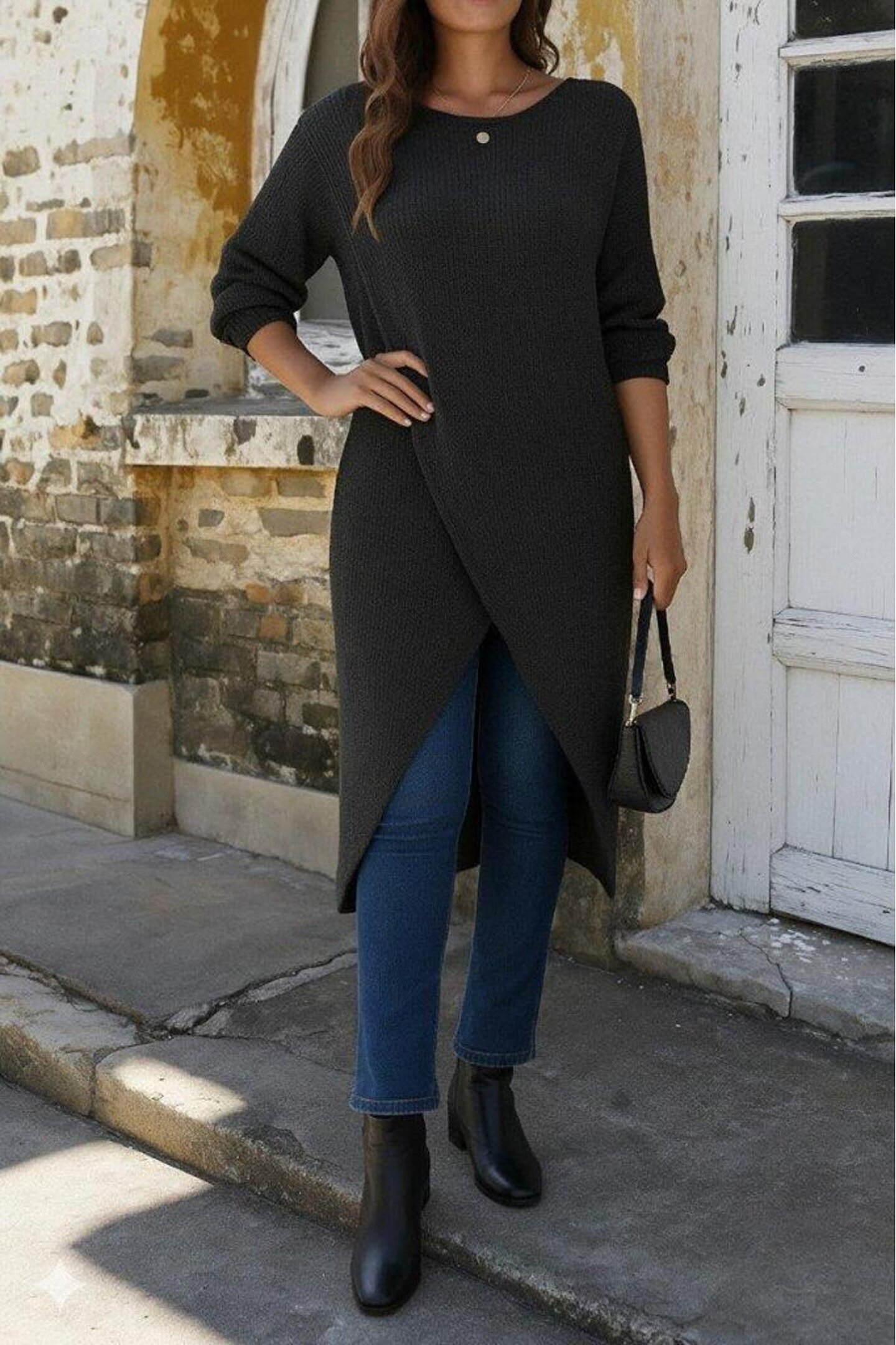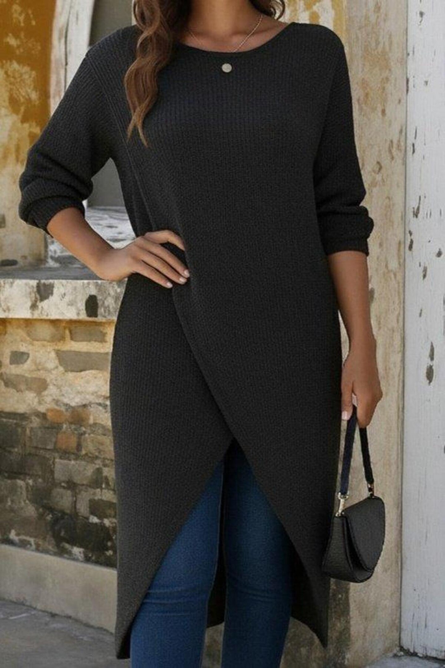 Kadın Uzun Kollu Bisiklet Yakalı önden çapraz Kesim Detaylı Midi Triko Elbise