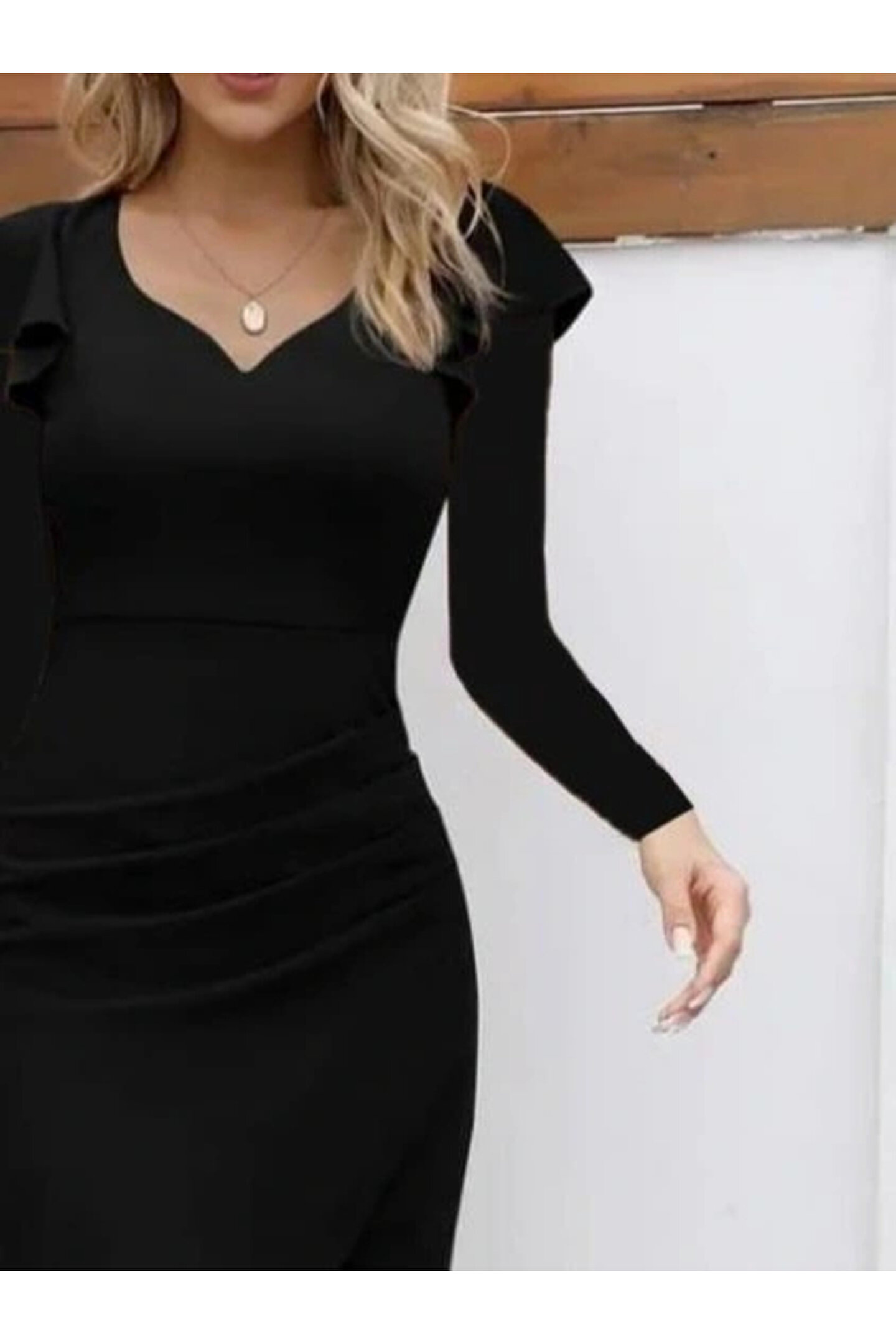 Kadın Uzun Kollu Kalp Yaka önden çapraz Detaylı Midi Ithal Krep Elbise