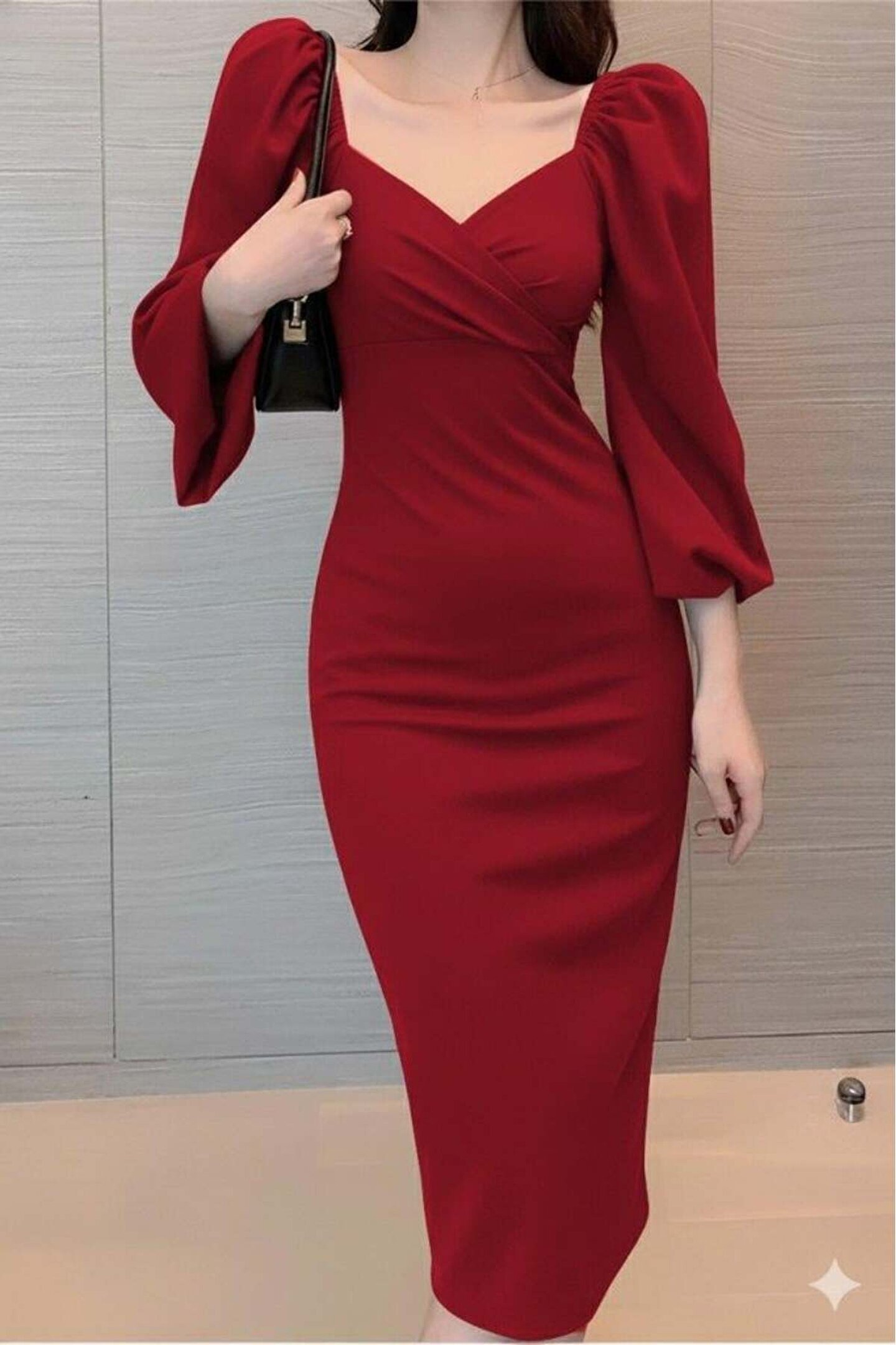 Kadın Uzun Kollu Kalp Yakalı Midi Ithal Krep Elbise
