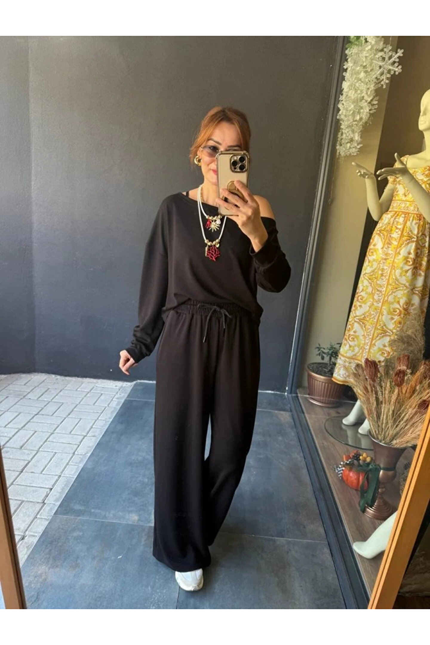 Kadın Uzun Kollu Tek Omuzdan Açık Viskon Iki Iplik Bluz Ve Pantolon Ikili Takım
