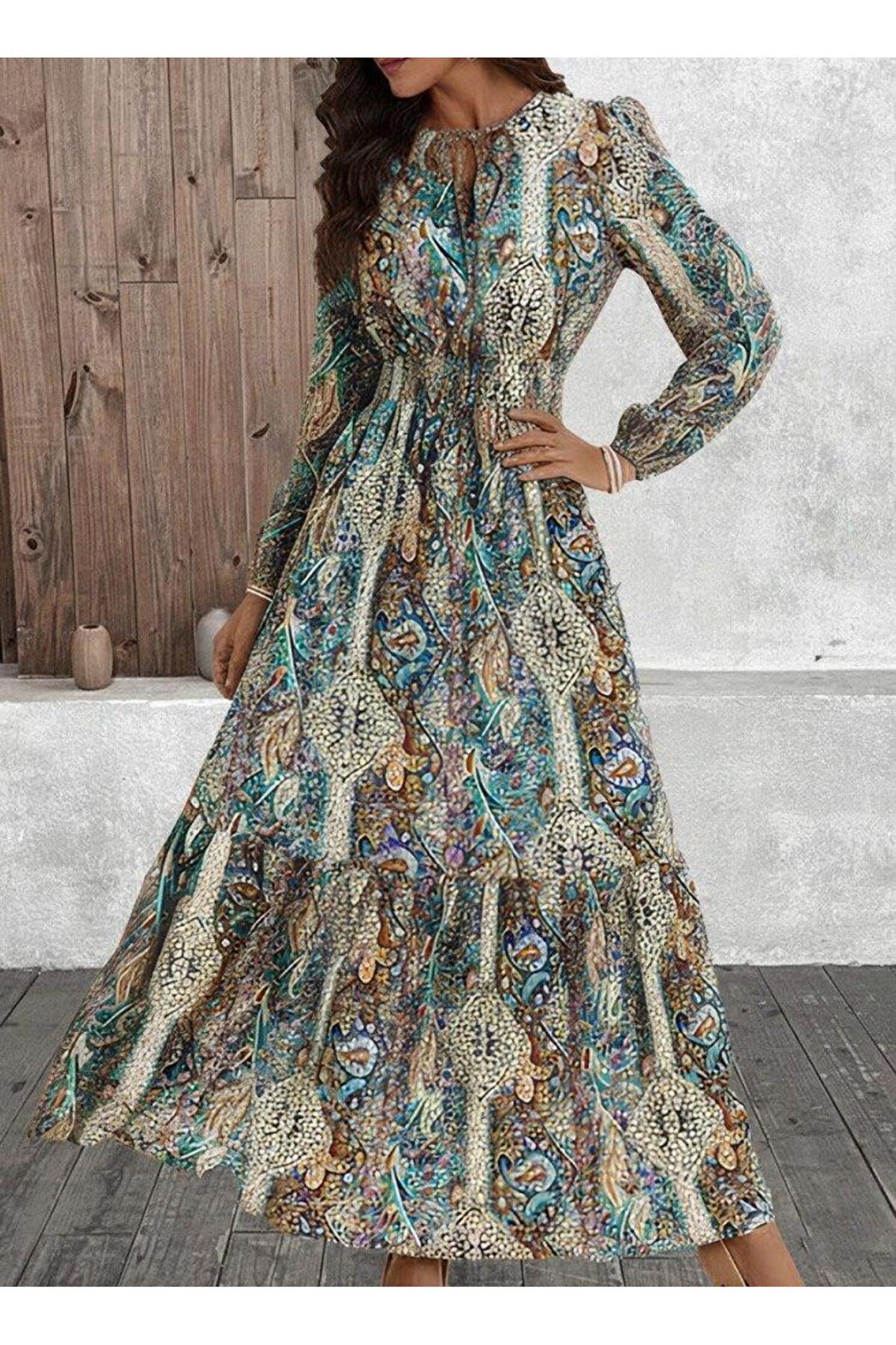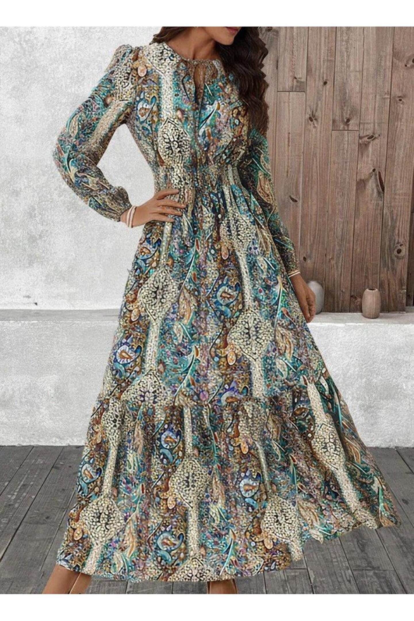 TBL DEKOR Kadın Uzun Kollu Uakadabağcıklı Beli Lastikli Desenli Uzun Süprem Elbise