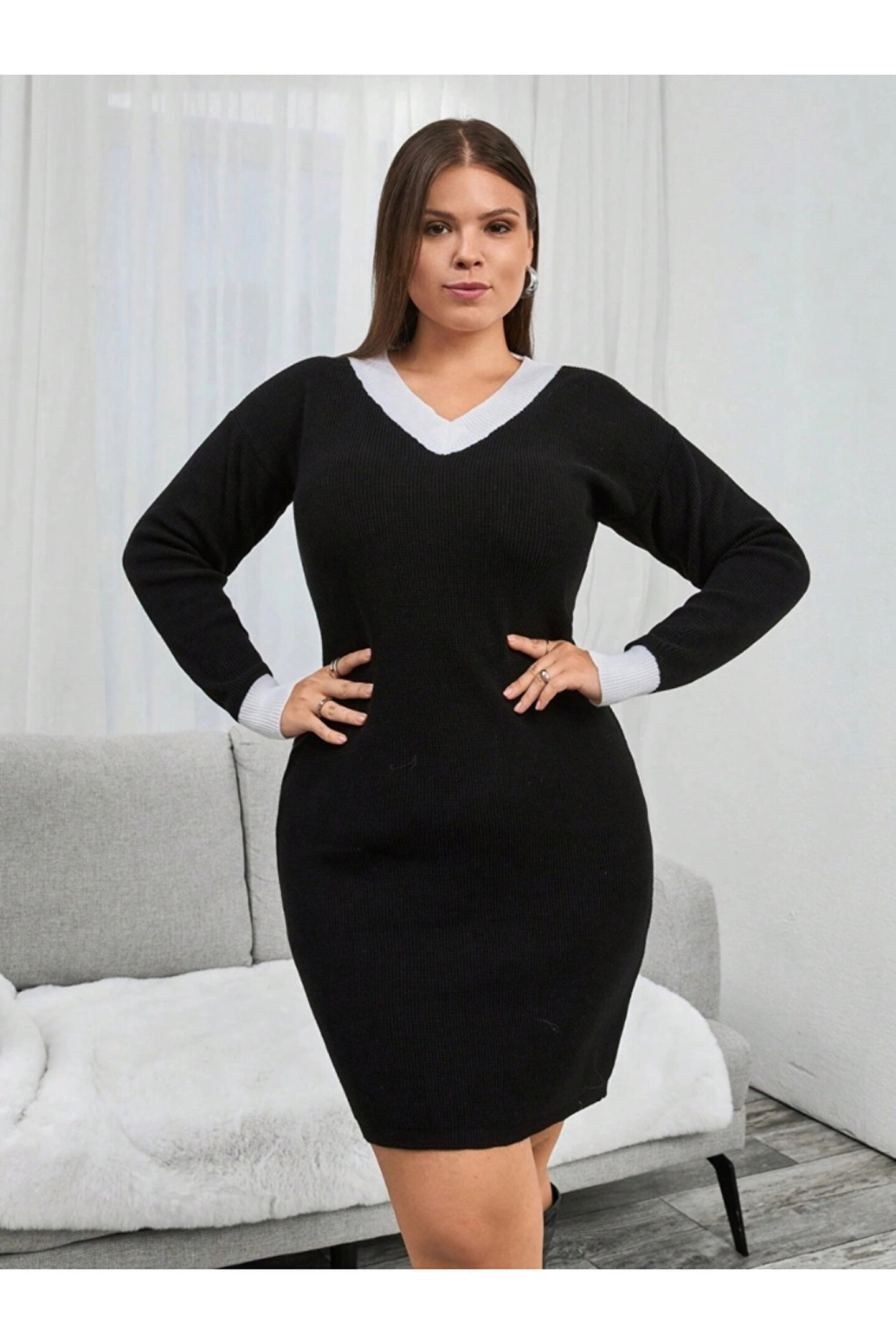 Kadın Uzun Kollu V Yakalı Kısa Triko Elbise