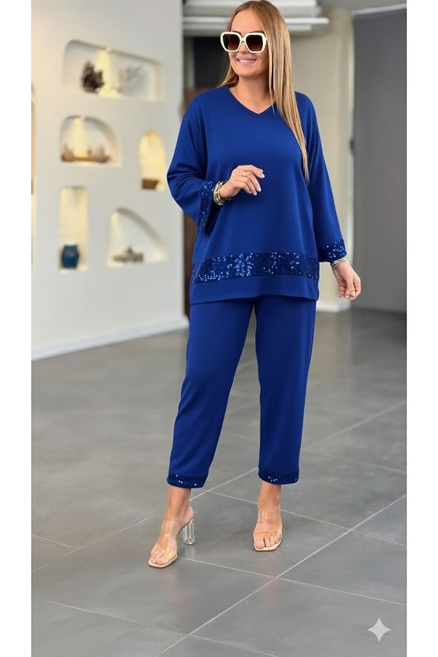 Kadın Uzun Kollu V Yakalı Pulpayet Viskon Iki Iplik Bluz Ve Pantolon Takım