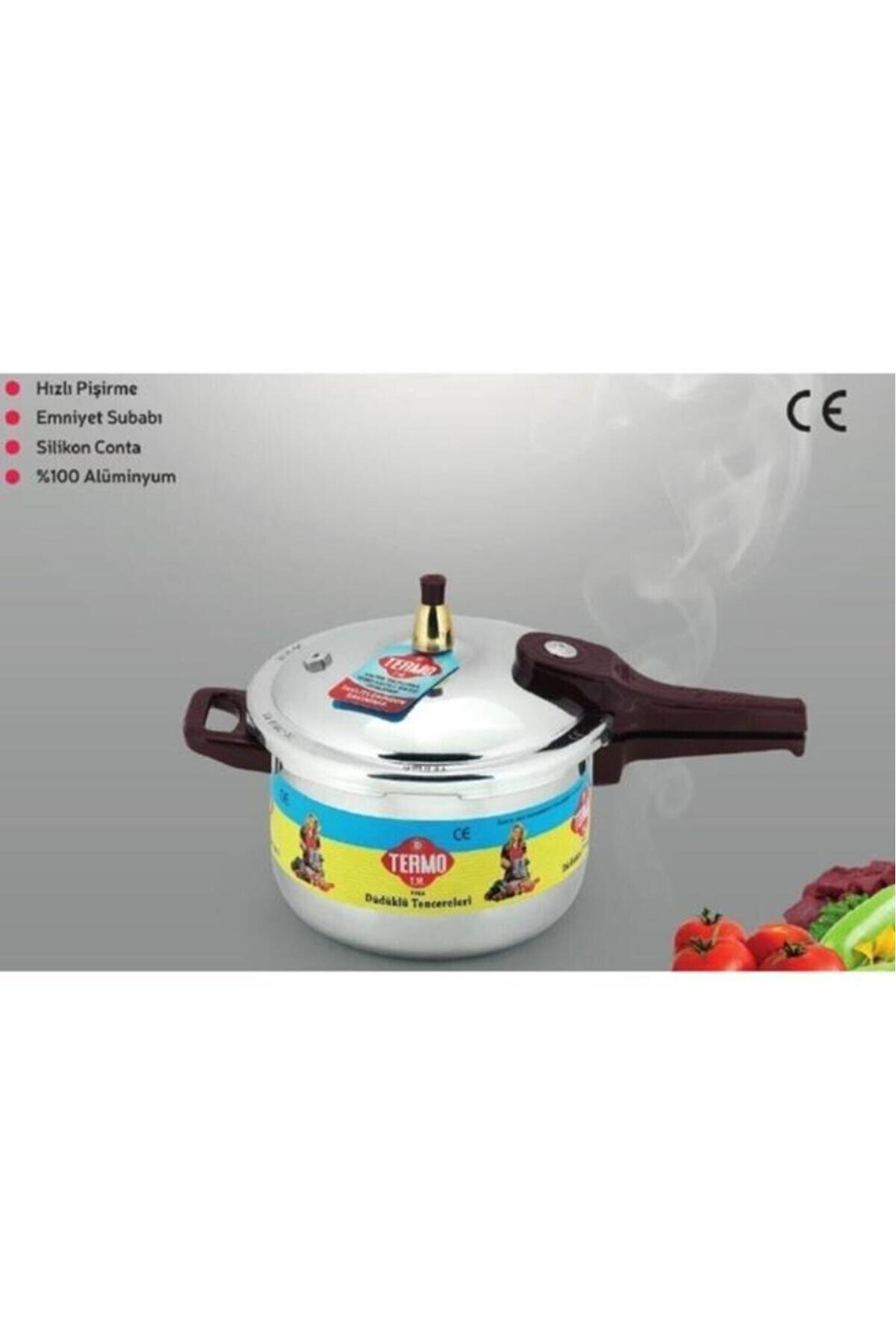 Termo alüminyum düdüklü tencere 5 litre Hızlı pişirme Emniyet subabı Silikon conta % 100 alüminyum Pişirme basıncı: 1 bar Emniyet basıncı: 2,5 bar Ilk kullanım öncesi lütfen kullanım talimatını okuyunuz Düdüklü tencerenizi ilk kullanmadan önce içinde 1 litre kapağı açık şekilde süt kaynatılması tavsiye edilir Kaynayan sütü atınız Uyarılar ve önemli notlar sayfasında yazan talimatlara uyulması tavsiye edilir