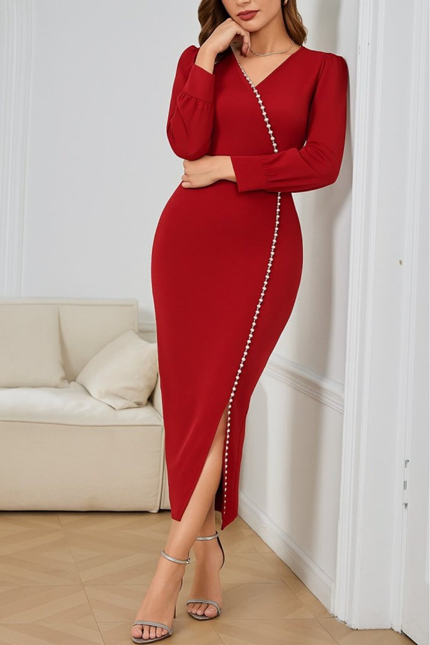 The KETHEN Kadın Uzun Kollu V Yakalı Yırtmaçlı Taşlı Uzun Ithal Krep Elbise