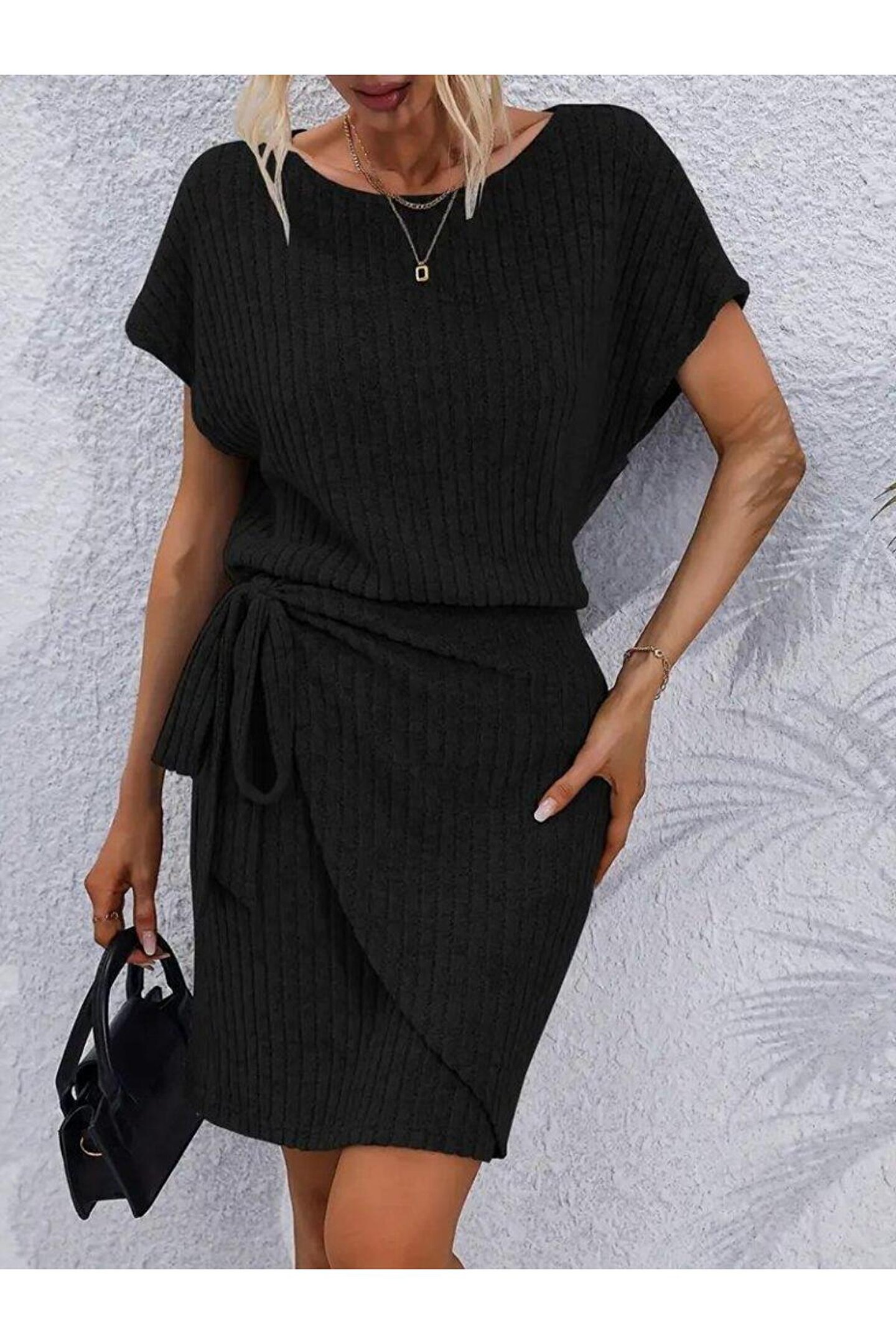 Kadın Kısa Kollu Yakası Açık Belden Lastikli Yandan Bağlamalı Kalın Fitilli Kaşkorse Elbise