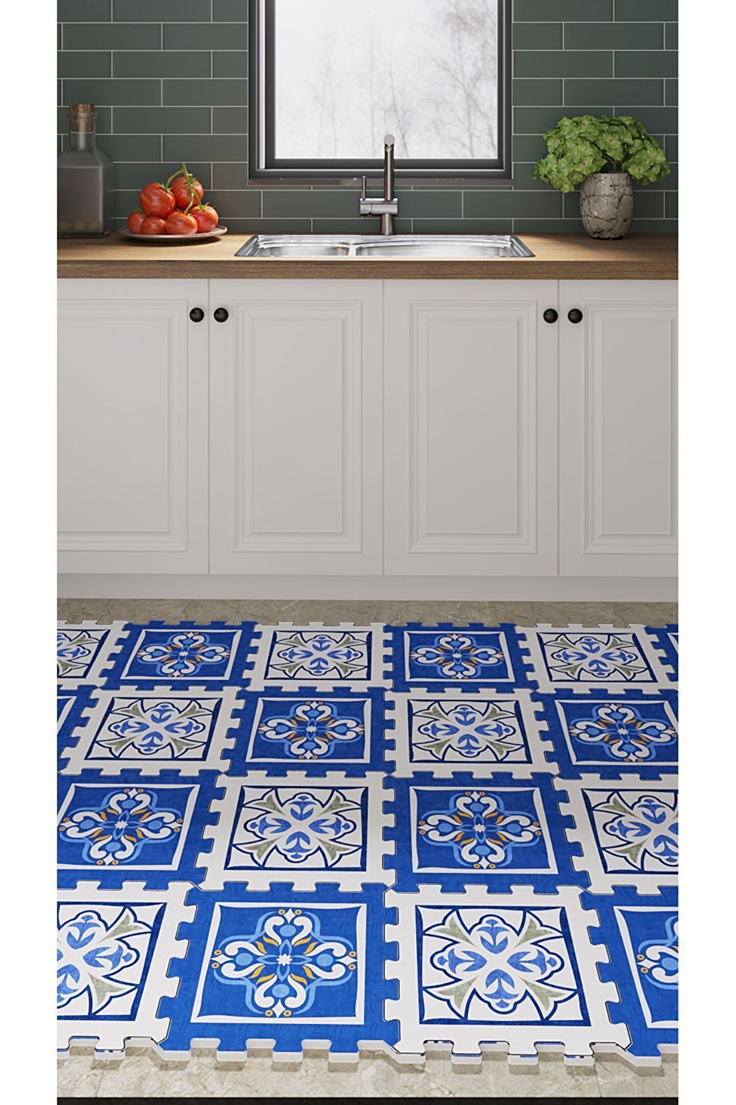 Tokyo Halı Dekoratif Mavi Beyaz Desenli Mutfak Halısı Thm35 | Yapboz Halı | Puzzle Halı