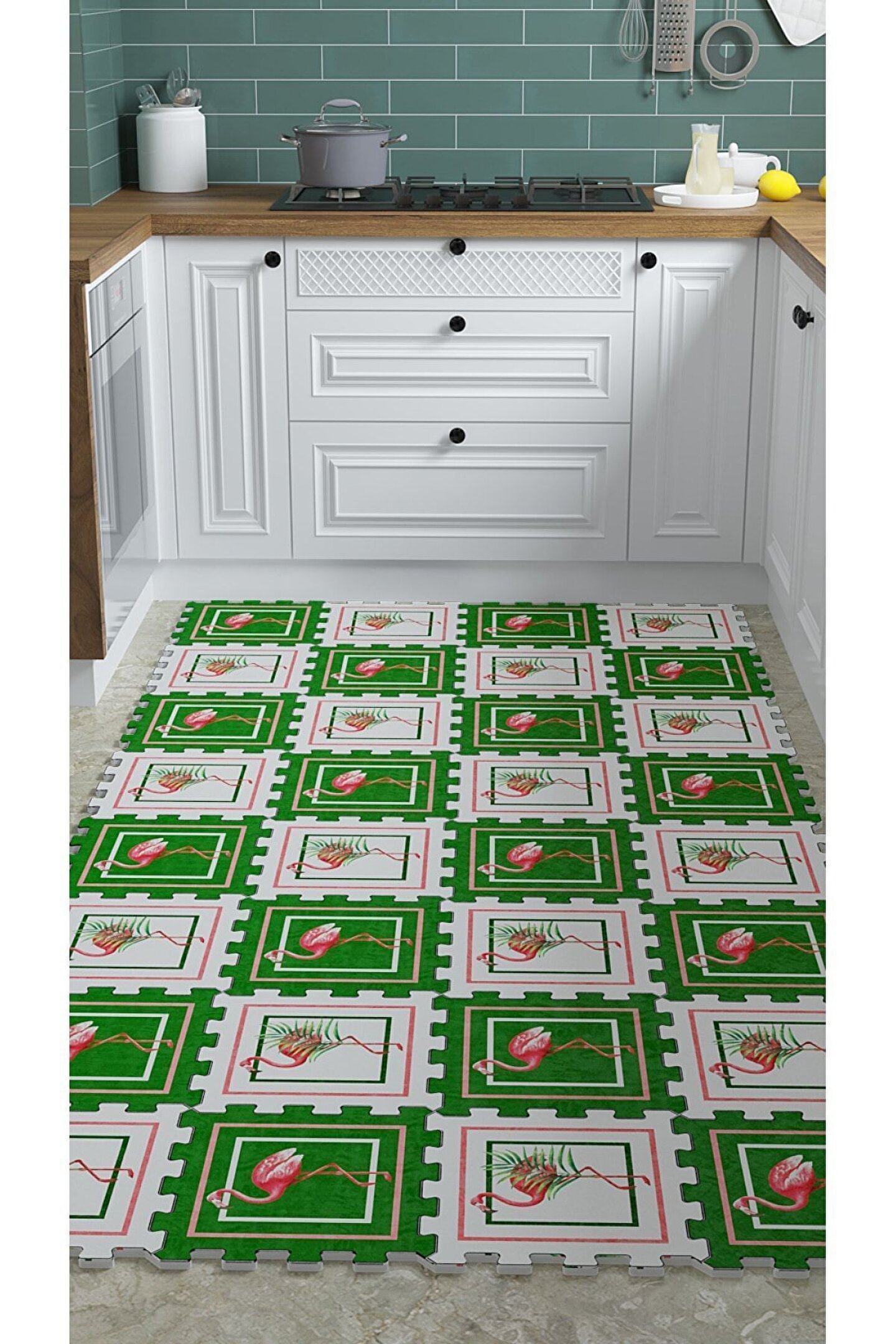 Tokyo Halı Leylekli Yeşil Beyaz Mutfak Halısı Thm10 | Yapboz Halı | Puzzle Halı